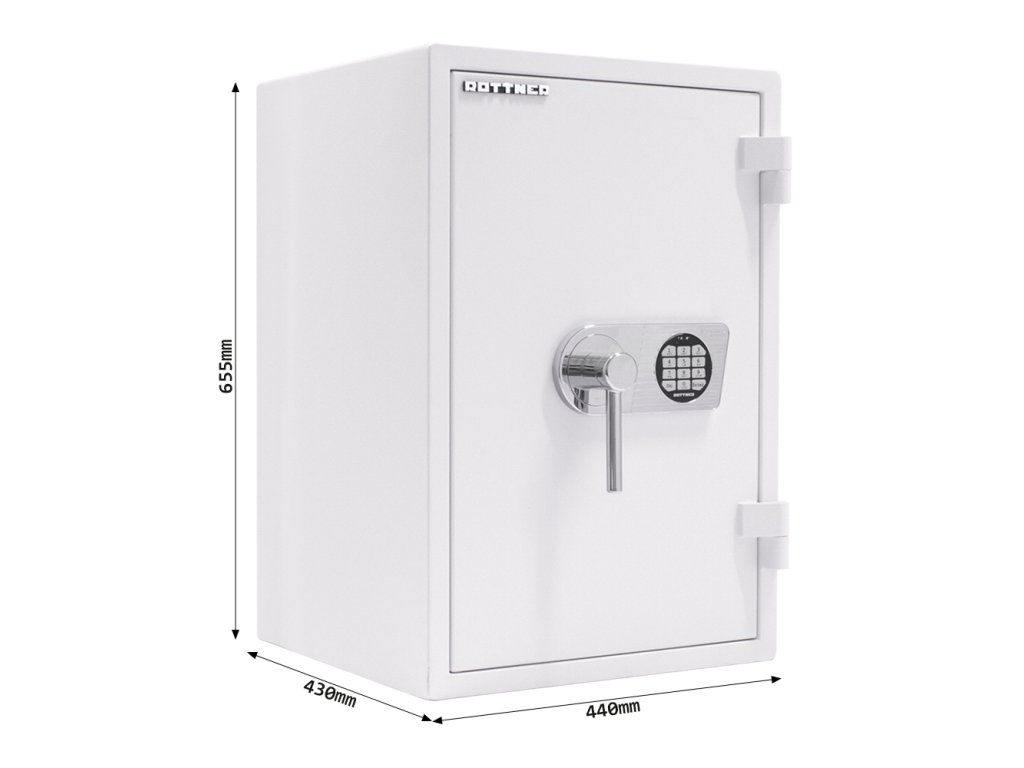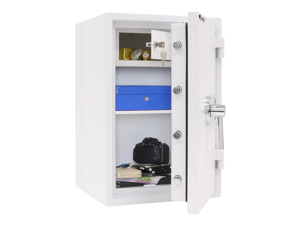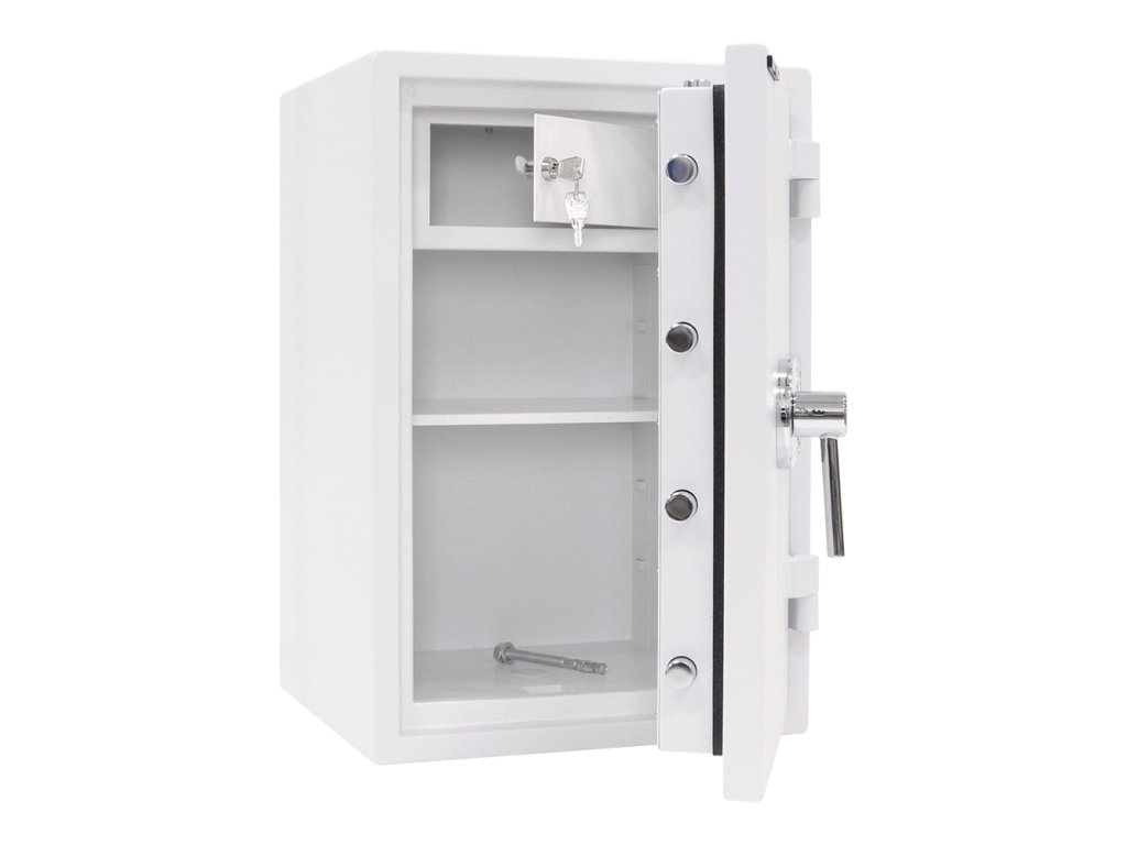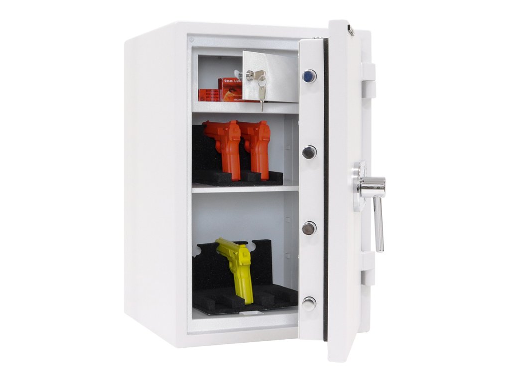 Hlavní výhody: Certifikovaný elektronický zámek Bezpečnostní třída I (ČSN EN 1143-1) Odolnost proti ohni až do 30 minut Možnost úschovy i zbraní a střeliva podle č.190 / 2003 Sb. z. 3 stranný uzamykací mechanismus Betonová výplň mezi pláštěm trezoru Napájení 1 x 9V baterií (není součástí balení) Vnitřní schránka s cylindrickým zámkem a 2 klíči Nastavitelná polička uvnitř Otevření dveří až do 180° Elektronické nouzové otevírání externí baterií a vnějšími kontakty Otvory na ukotvení na spodní straně trezoru Bílý ocelový trezor z modelové řady Atlas nabízí bezpečnostní třídu I (ČSN EN 1143-1) a certifikovaný elektronický zámek. Zámek je napájen klasickou 9V baterií. Velkou výhodou je odolnost proti ohni a to až do 30 minut. Uvnitř tak můžete uchovávat cenné dokumenty, cennosti, šperky nebo cestovní doklady. Také je zde dostatek prostoru pro krátké zbraně a munici. Potěší nastavitelná polička uvnitř a samostatně uzamykatelná kazeta. Pokud odstraníte šrouby vnitřního trezoru, lze jej také vyjmout z hlavního trezoru. Trezor má navíc betonovou výplň a dveře otevřete až do 180° úhlu. Přístup do vnitřku je tak pohodlný a bezproblémový. Na spodní straně se nacházejí předpřipravené otvory pro upevnění trezoru na podlaze. Kotvící materiál je součástí balení.Doplňkové parametry