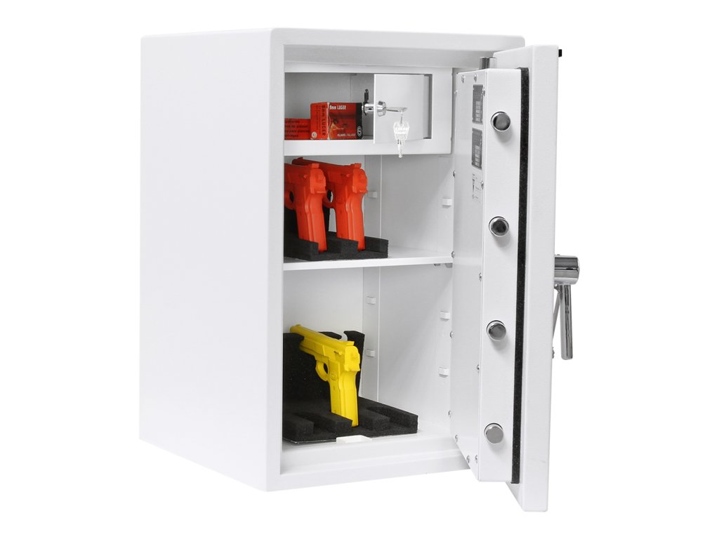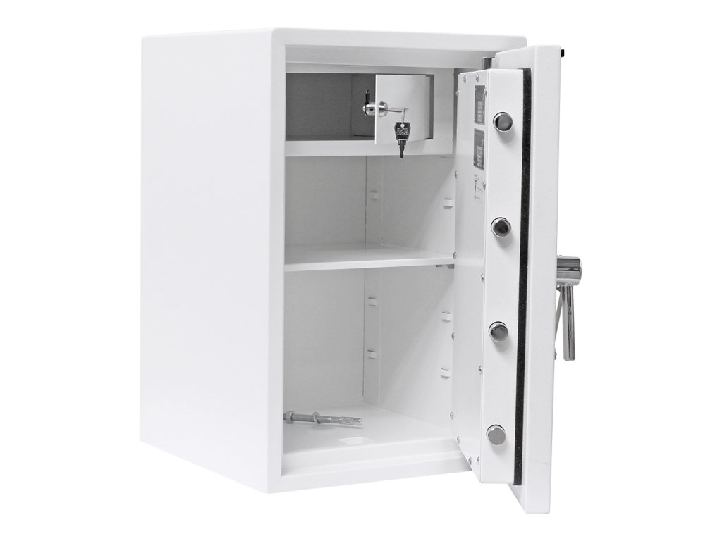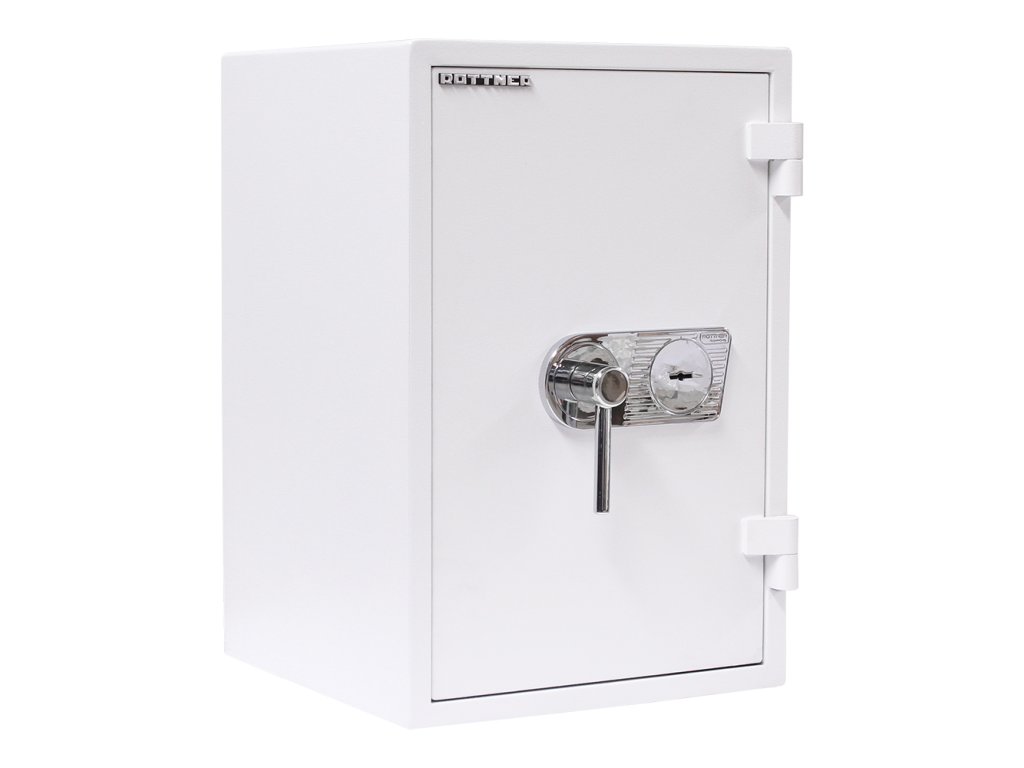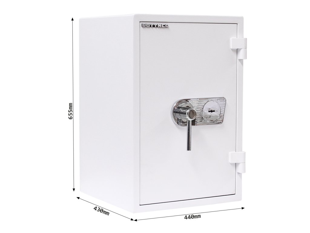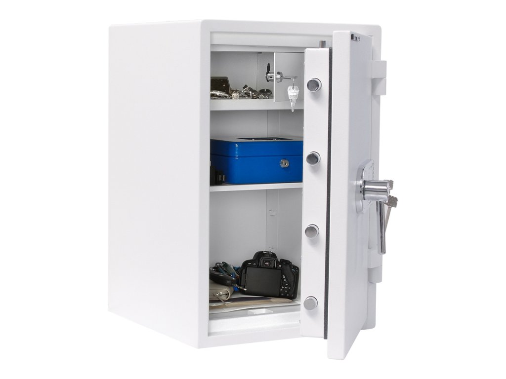 Certifikovaný trezorový trezor s 2 klíči Bezpečnostní třída I (ČSN EN 1143-1) Ohnivzdornost po dobu 30 minut pro papír Vnitřní schránka Polička uvnitř