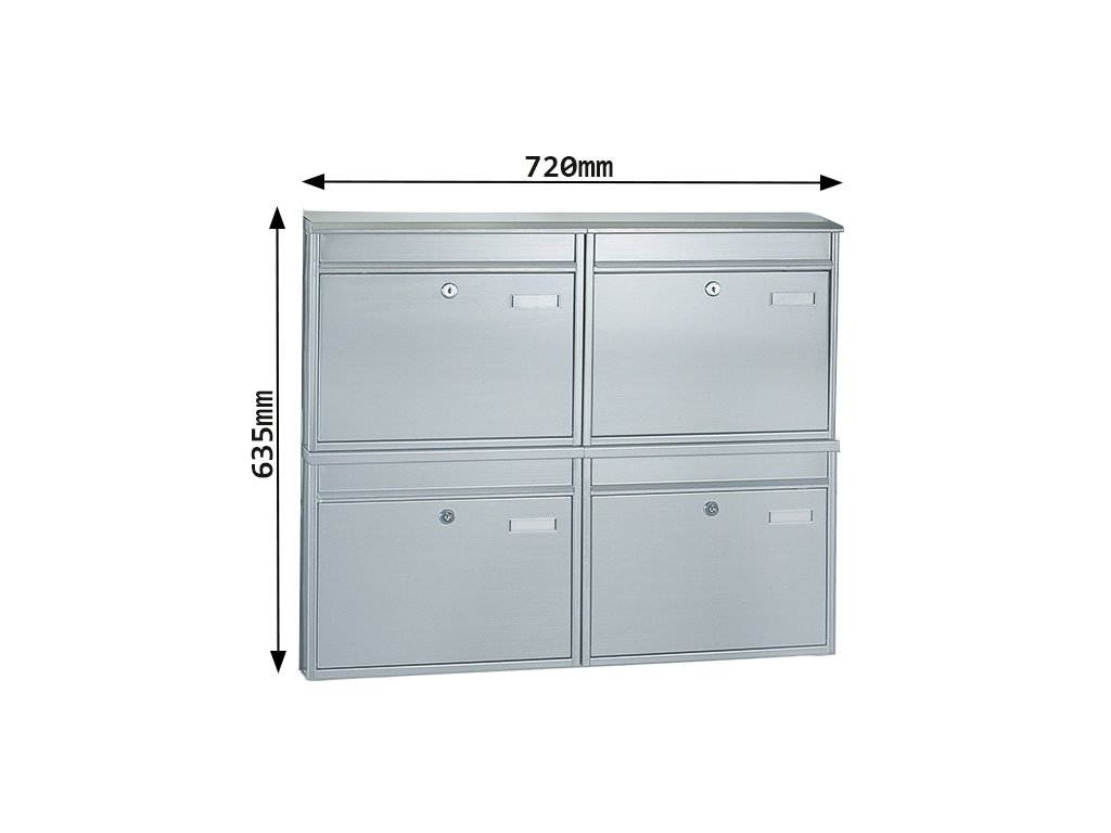 Hlavní výhody: Cylindrické zámky se 2 klíči Přední vhod pro poštu Odolnost proti povětrnostním vlivům a korozi Jmenovky Bez stojanu Celkově 4 poštovní schránky vyrobeny z kvalitní nerezové oceli spolehlivě doleva povětrnostním podmínkám a možné korozi. Každá poštovní schránka disponuje cylindrickým zámkem spolu s 2 klíči. Přední vhod je chráněn krytkou, aby dovnitř nevnikala dešťová voda a jiné nečistoty, které by mohly vaši poštu znehodnotit. Každá schránka má vlastní jmenovku. Poštu po doručení pohodlně vyberete přes přední dvířka. Upozorňujeme, že poštovní schránky jsou dodávány bez stojanu, který lze dokoupit samostatně. Schránky mají připraveny otvory pro upevnění do stojanu. Materiál k upevnění je součástí balení.Doplňkové parametry