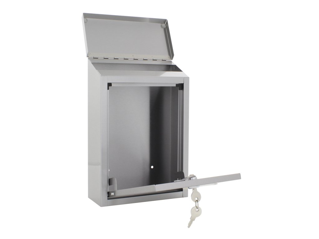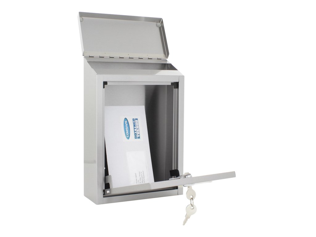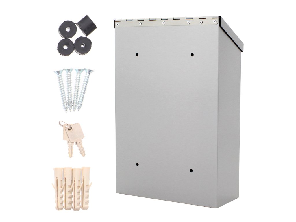Hlavní výhody: Cylindrický zámek s 2 klíči Nerezová ocel odolná proti povětrnostním podmínkám Horní otvor pro vhod pošty velikosti A4 Otvor pro vhod pošty chráněný stříškou Jmenovka Klasický tvar poštovní schránky vyroben z nerezavějící oceli doplněn o tři malé okénka, které ukáží, ať už vaše pošta dorazila. Horní otvor pro vhazování pošty je akorát pro poštu do velikosti A4. Zároveň je krytý stříškou, která zabrání nežádoucímu vnikání vody a nešistôt do schránky. Samozřejmostí je jmenovka spolu s přiloženým upevňovacím materiálem, abyste si mohli schránku hned po obdržení přimontovat na stěnu.Doplňkové parametry