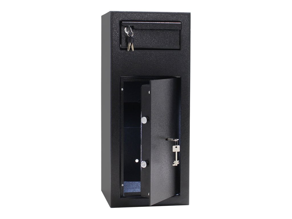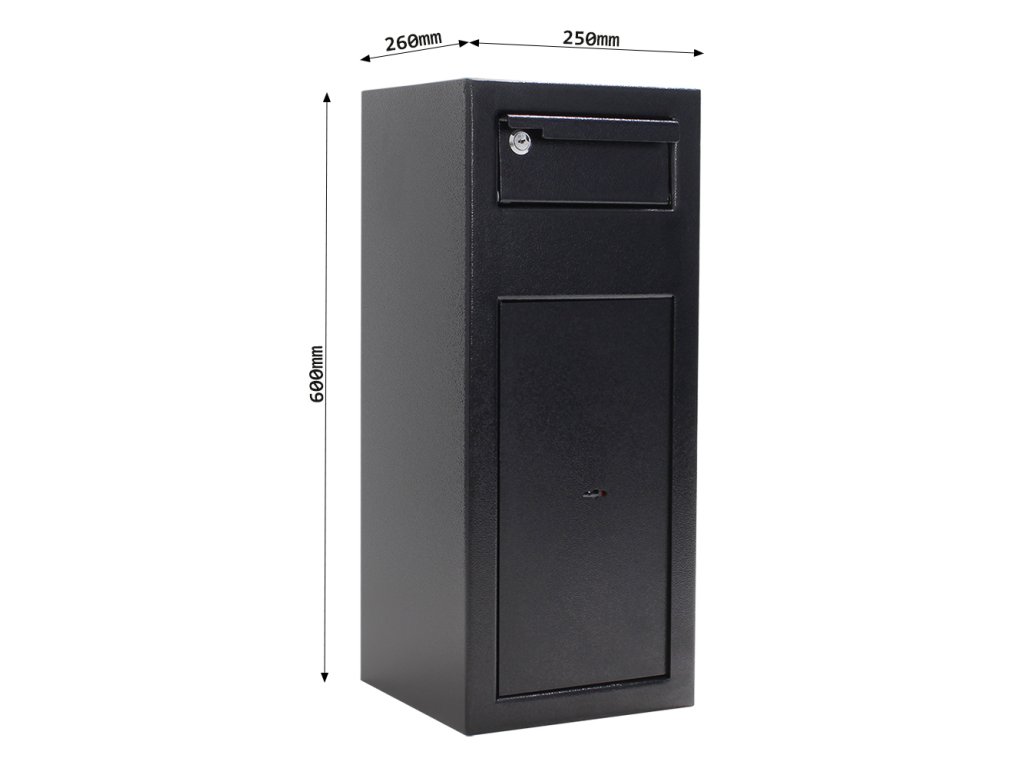 Hlavní výhody: Standardní trezorový zámek s 2 klíči Vhozové zásuvka se 4 klíči Protizávaží pro automatické zavření vhozové zásuvky Otvory na ukotvení na spodní a zadní straně sejfu Výborně navržený a bezpečný sejf s vhazovacím mechanismem v černé barvě je ideální pro kanceláře, obchody, hotely, školy a jiná místa, kde se denně manipuluje s hotovostí. Použití Vhozové sejfu je opravdu jednoduché a díky 4 klíčem od horní Vhozové zásuvky umožňuje přístup více lidem. Pomocí přiloženého klíče otevřete horní zásuvku a vložte požadovaný předmět. Díky protizávaží se schránka automaticky zavře, je ale třeba zásuvku uzamknout. Vložený předmět sám propadne do dolní části sejfu. Inkasovaná hotovost a cennosti tak budou v bezpečí a do sejfu je stále možné vhazuje novou a novou bez ohrožení již vhozené hotovosti. Připravené otvory v dolní a zadní části slouží k ukotvení sejfu. Kotvící materiál je součástí balení.Doplňkové parametry