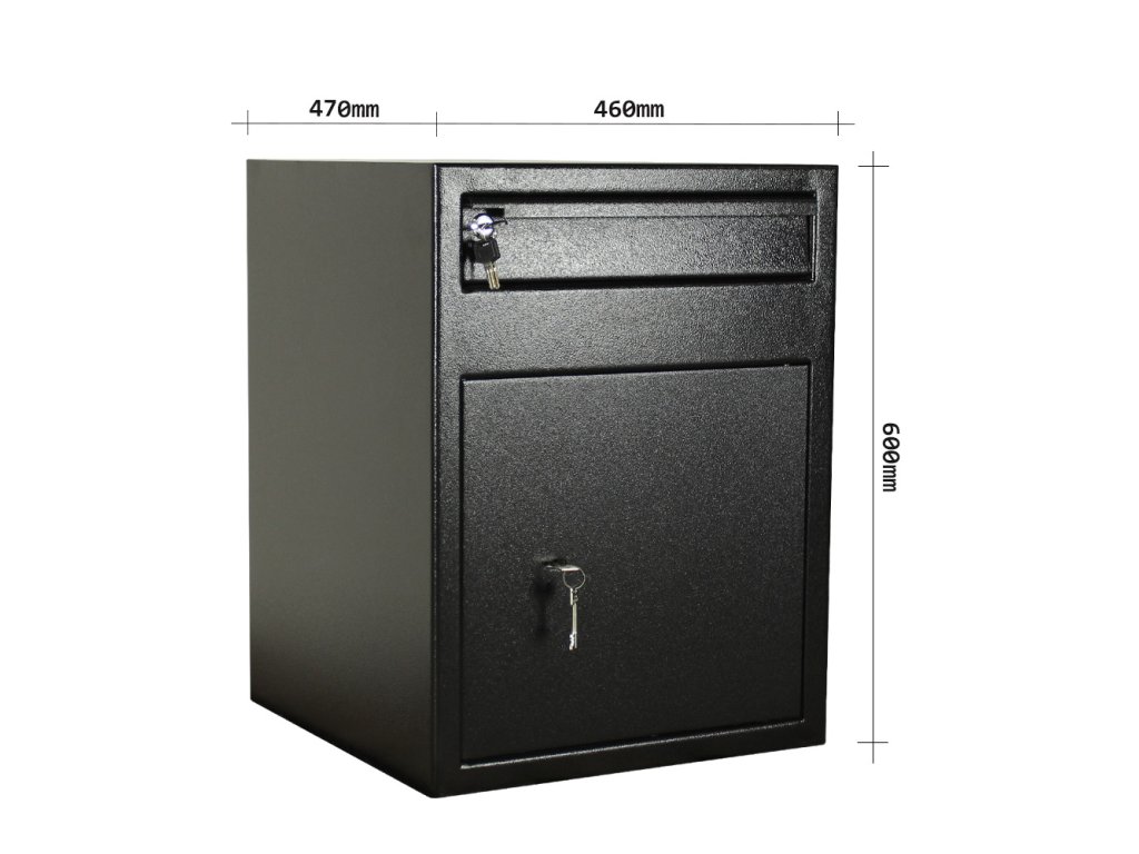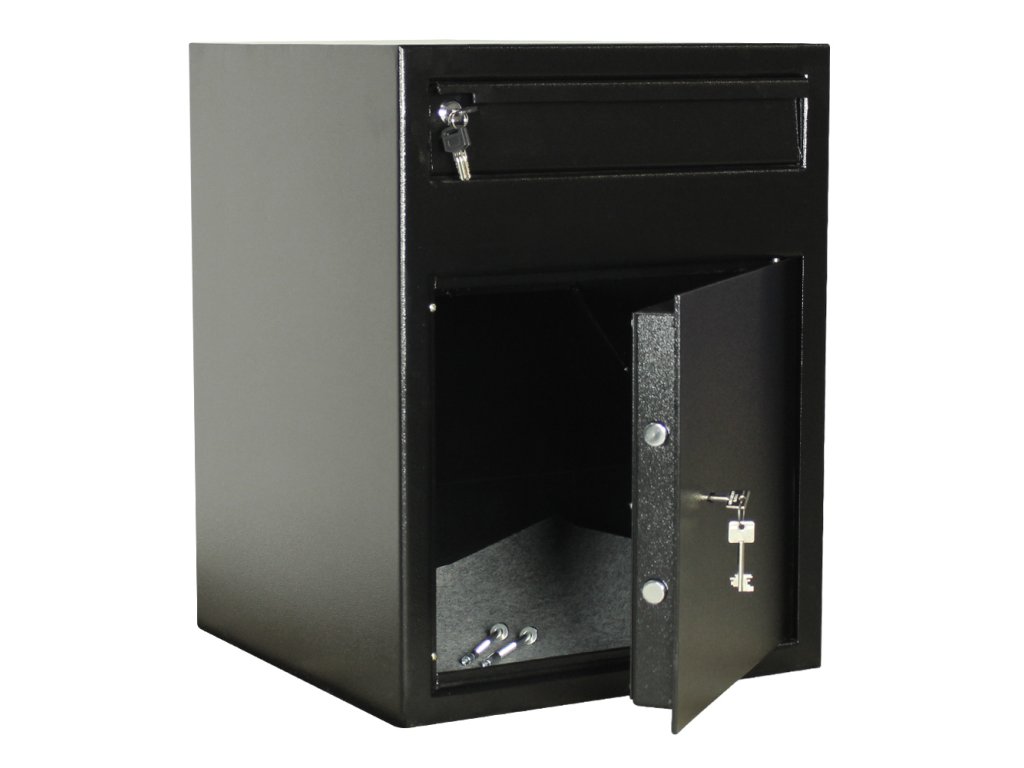 Standardní trezorový zámek s 2 klíči Vhozová zásuvka se 4 klíči Protizávaží pro automatické zavírání zásuvky Špičkové ocelové provedení