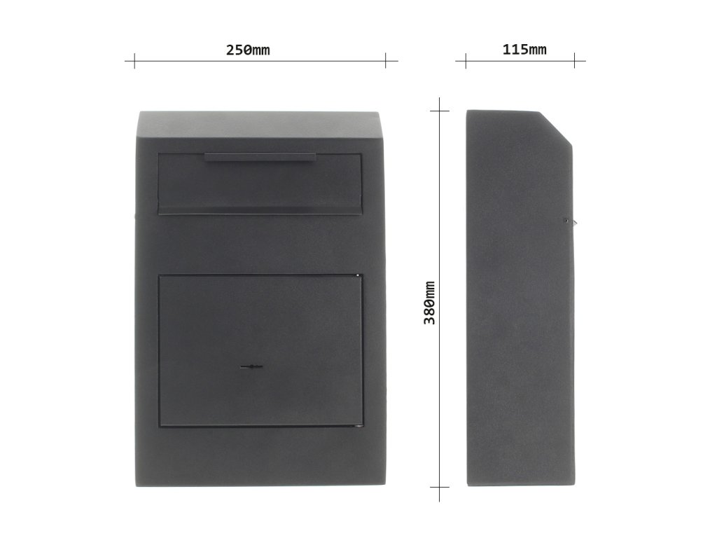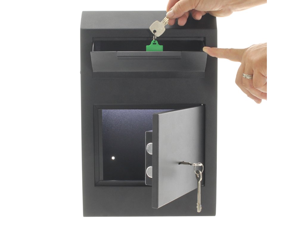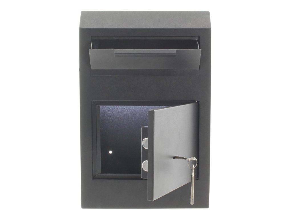Hlavní výhody: Standardní trezorový zámek s 2 klíči Vhazovací mechanizmus Úhel otevření dveří do 90 ° Otvory na ukotvení ve spodní i zadní straně sejfu Sejf, který kombinuje výhody klasické poštovní schránky a vlastnosti sejfu. Vhazovací mechanismus v horní části sejfu zajistí potřebnou ochranu již vhozených věcí. Následně je možné vhozené věci vybrat otevřením spodních dveří sejfu, které jsou chráněny klíčovým zámkem. Skvělý varianta pro každého, kdo hledá kompromis mezi vlastnostmi poštovní schránky a sejfem. Sejf můžete připevnit díky připraveným otvorům na spodní i zadní straně. Kotvící materiál je součástí balení.Doplňkové parametry