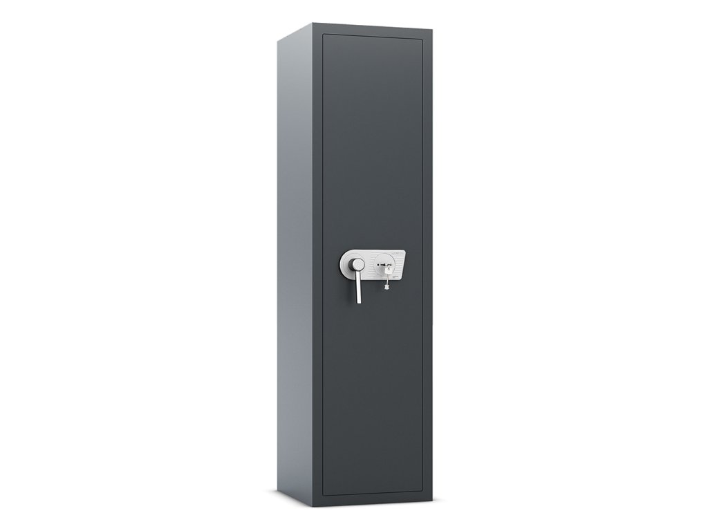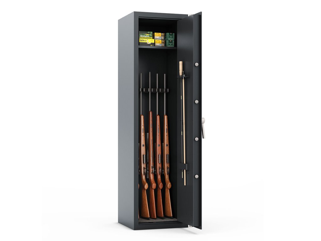 Hlavní výhody: Certifikovaný trezorový zámek se 2 klíči Bezpečnostní třída O (ČSN EN 1143-1) Vhodné pro 5 dlouhých zbraní Polička uvnitř Plastové držáky na zbraně Držák na čistící potřeby pro zbraně Otvory na ukotvení na spodní i zadní straně trezoru Černý trezor na dlouhé zbraně má podobu stojaté skříně a disponuje trezorovým zámkem spolu s 2 klíči. Vámi uložené zbraně budou chráněny bezpečnostní třídou 0 (ČSN EN 1143-1), přičemž do trezoru je můžete celkově umístit v počtu 5 kusů. V horní části trezoru se nachází polička, do které můžete umístit např. munici pro zbraně. Na vnitřní straně dveří se nachází praktický držák na čistící potřeby. Vše pro vaše zbraně na jednom místě. Na spodní a zadní straně jsou připraveny otvory pro ukotvení. Kotvící materiál je součástí balení. Kování zámku zvyšuje celkovou vnější hloubku trezoru o 60 mm. Splňuje podmínky dle zákona č. 119/2002 Sb. o zbraních a střelivu.Doplňkové parametry