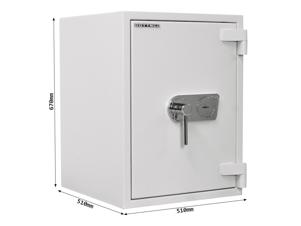 Certifikovaný trezorový zámek Bezpečnostní třída II (ČSN EN 1143-1) Ohnivzdornost po dobu 30 minut pro papír Vnitřní schránka a polička uvnitř