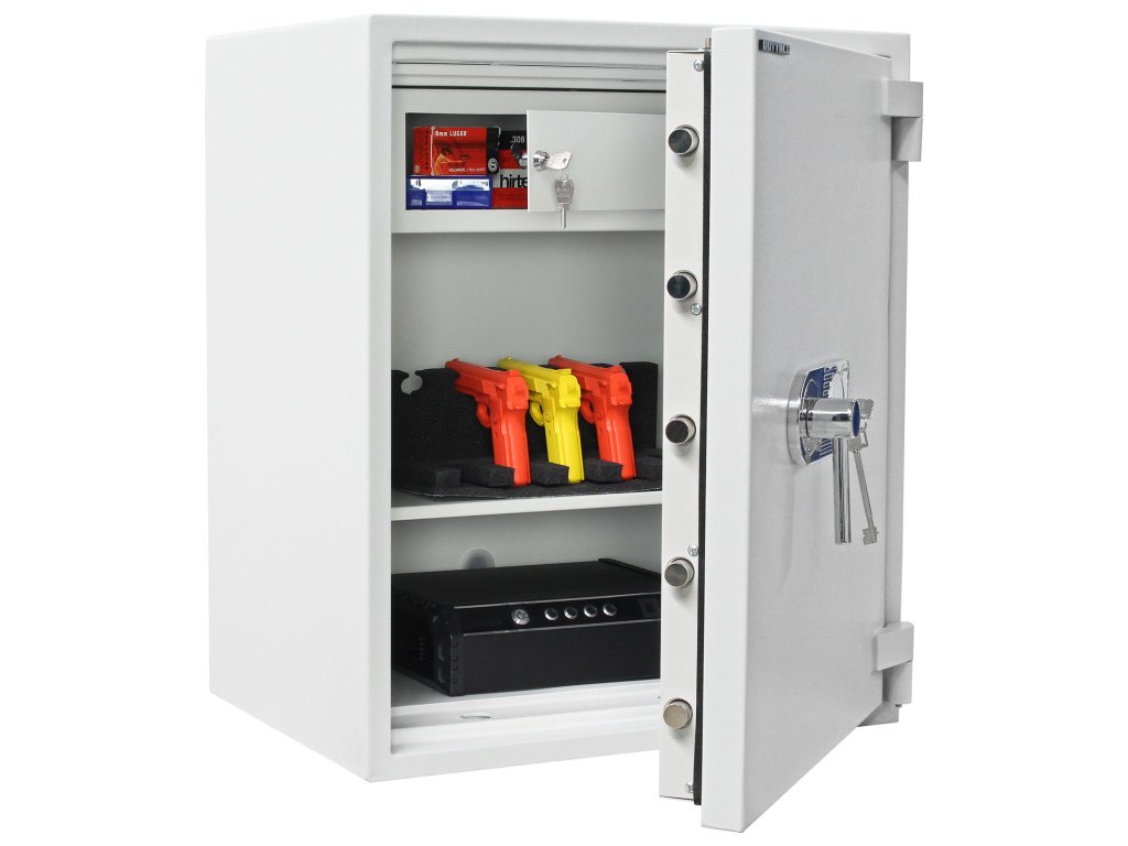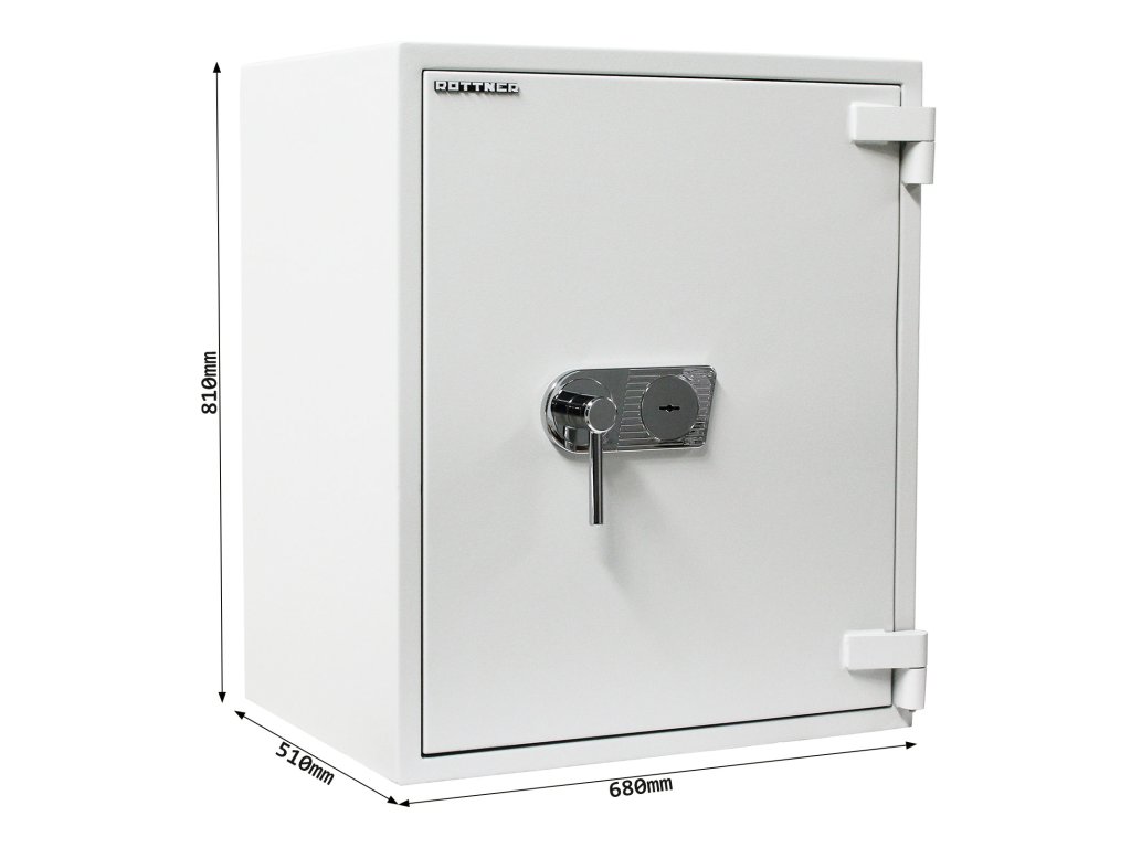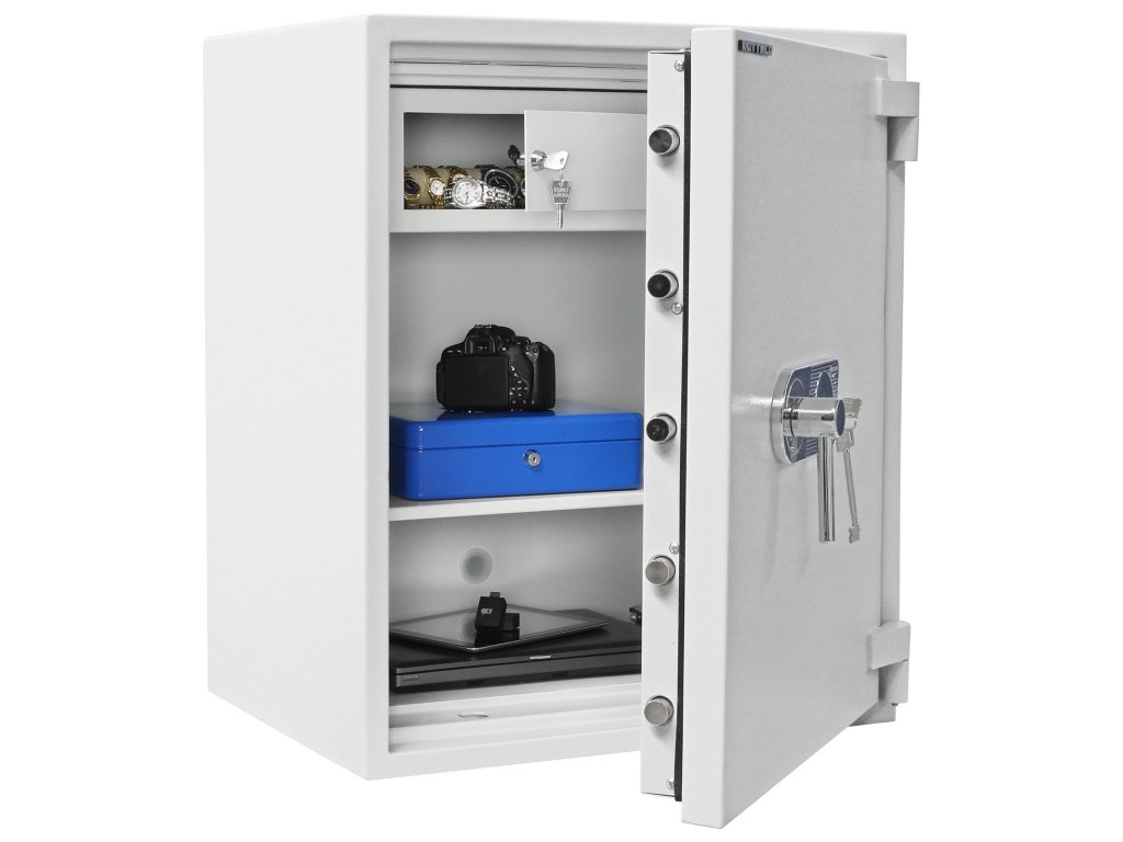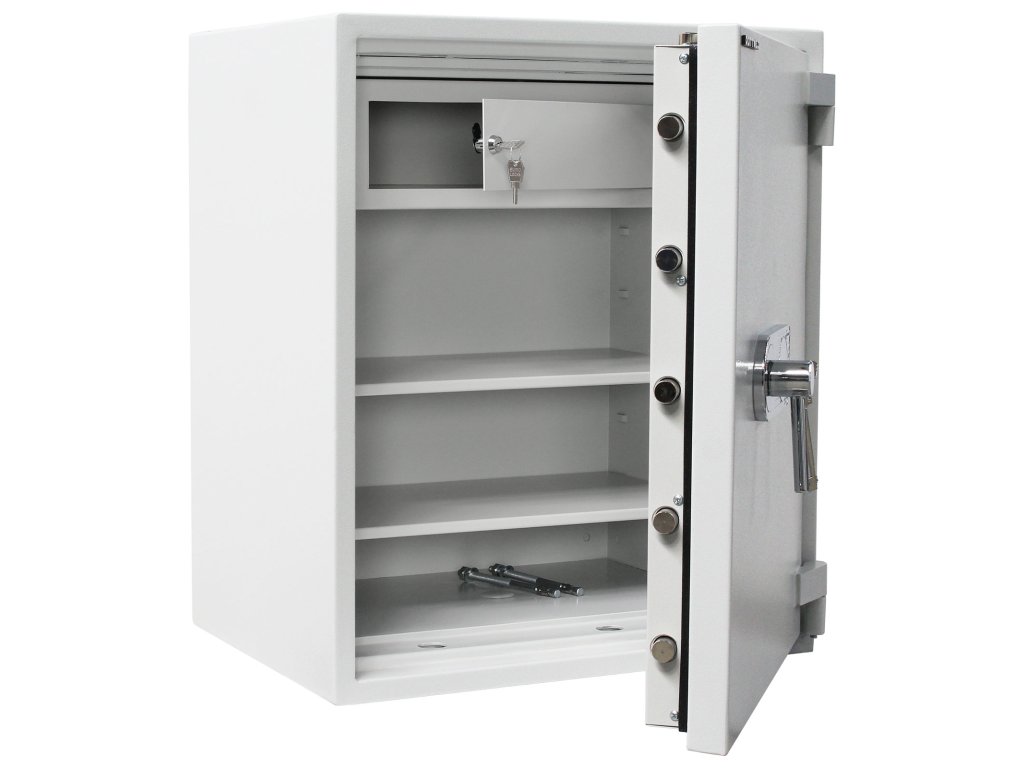 Certifikovaný trezorový zámek Bezpečnostní třída II (ČSN EN 1143-1) Ohnivzdornost po dobu 30 minut pro papír Vnitřní schránka 2 poličky uvnitř