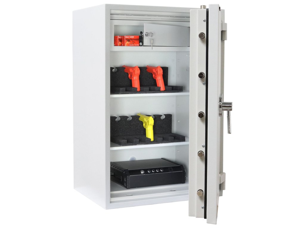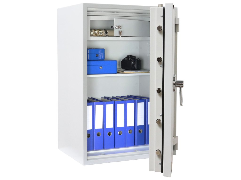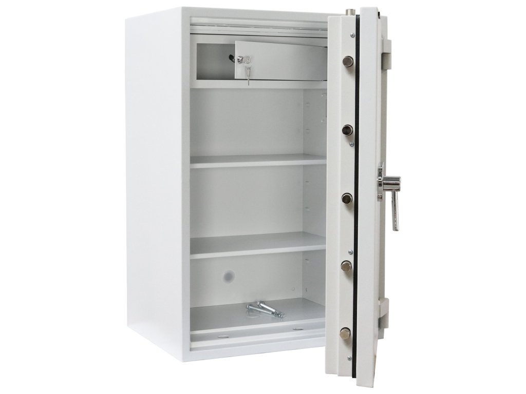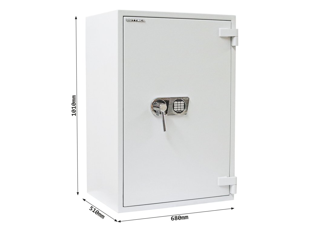 Certifikovaný elektronický zámek Bezpečnostní třída III (ČSN EN 1143-1) Napájení 1 x 9V baterií (není součástí balení) Ohnivzdornost po dobu 30 minut pro papír Vnitřní schránka 2 poličky uvnitř