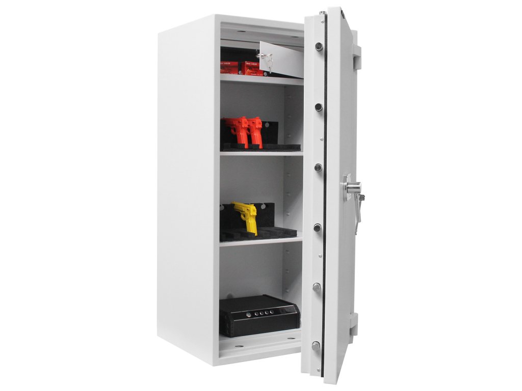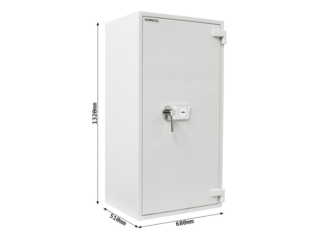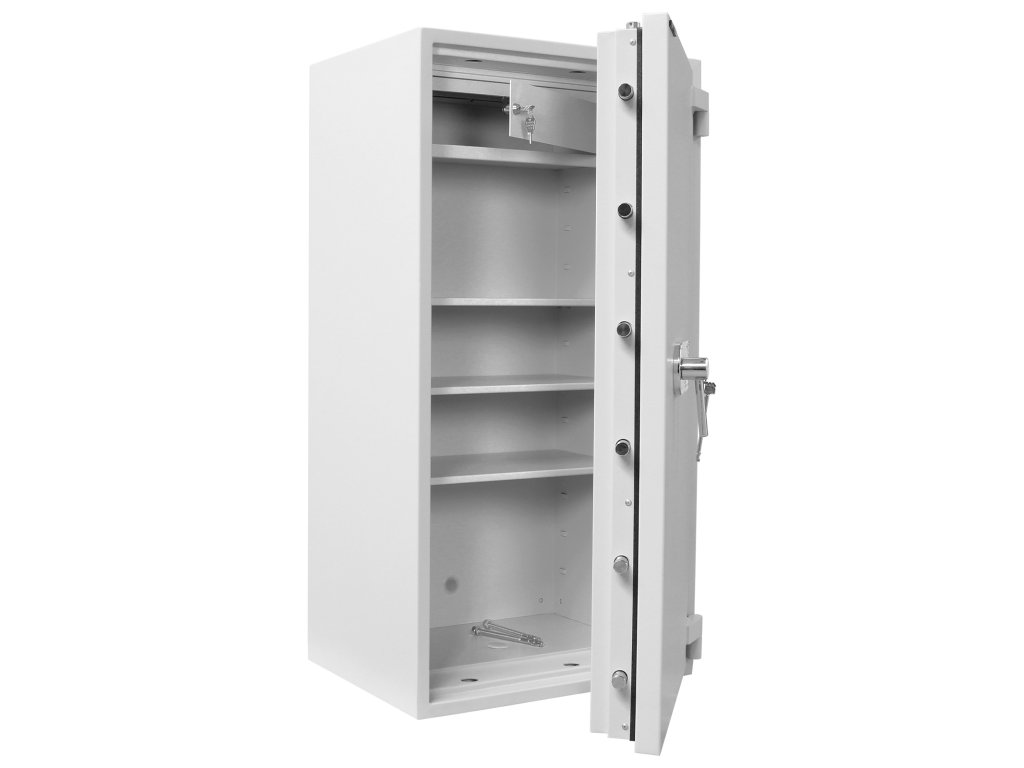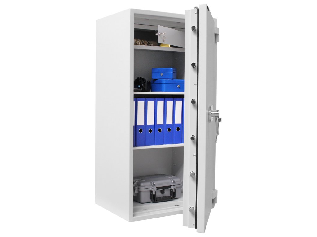 Certifikovaný trezorový zámek s 2 klíči Bezpečnostní třída III (ČSN EN 1143-1) Ohnivzdornost po dobu 30 minut pro papír Vnitřní schránka 2 poličky uvnitř
