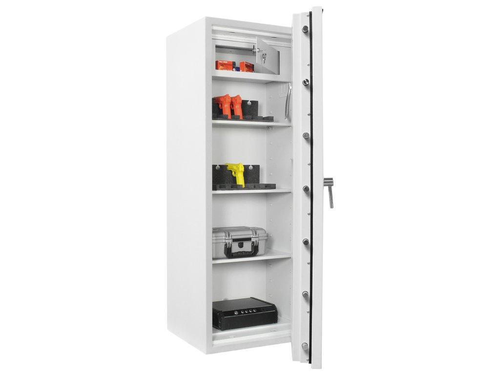 Hlavní výhody: Certifikovaný elektronický zámek Bezpečnostní třída III (ČSN EN 1143-1) Ohnivzdornost po dobu 30 minut pro papír Napájení 1 x 9V baterií (není součástí balení) 3-stranný uzamykací mechanizmus Vnitřní schránka s cylindrickým zámkem a 2 klíči 2 poličky uvnitř Korpus tloušťky 45 mm a dveře tloušťky 125 mm Otevírání dveří až do 180° Příprava pro EMA Možnost doobjednání teleskopické registratury Možnost doobjednání teleskopické zásuvky Možnost doobjednání teleskopické police Elektronické nouzové otevírání externí baterií Otvory na ukotvení na spodní a zadní straně trezoru Nábytkový ohnivzdorný trezor představuje výbornou možnost jak uschovat důležité cennosti, špekry, doklady, cestovní doklady ale i šanony a jiné dokumenty. Disponuje certifikovaným elektronickým zámkem s vnějšími kontakty pro přiložení externí baterie. Má certifikát bezpečnostní třídy III (ČSN EN 1143-1) a uložené věci ochrání proti ohni až po dobu 30 minut v případě papírových dokumentů. Přehledná klávesnice pro zadávání kódu a zámek jsou napájeny klasickou 9V baterií. Výhodou trezoru je vnitřní schránka a příprava pro EMA. Pro lepší uspořádání uložených věcí trezor disponuje 2 poličkami uvnitř. Na spodní a zadní straně trezoru se nacházejí připravené otvory pro ukotvení. Kotvící materiál je součástí balení. Kování zámku zvyšuje celkovou vnější hloubku trezoru o 60 mm.Doplňkové parametry