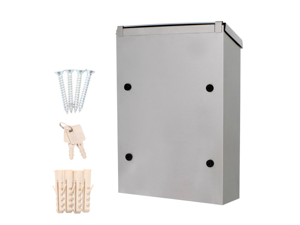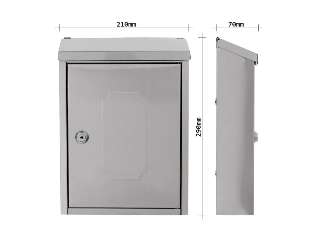 Hlavní výhody: Cylindrický zámek s 2 klíči Horní vhod pro poštu Bez jmenovky Odolnost proti povětrnostním vlivům Nerezová poštovní schránka s jednoduchým designem a velkými předními dvířky na výběr pošty. Na předních dvířkách je vyražen jednoduchý vzor. Poštovní schránka má horní vhod a pošta po vhozený bude zajištěna pomocí klasického cylindrického zámku se 2 klíči. Poštovní schránka Ferrara nemá prostor na jmenovku. Kvalitní zpracování odolá povětrnostním vlivům a korozi. Na zadní straně jsou připraveny otvory pro upevnění schránky. Materiál k upevnění je součástí balení.Doplňkové parametry