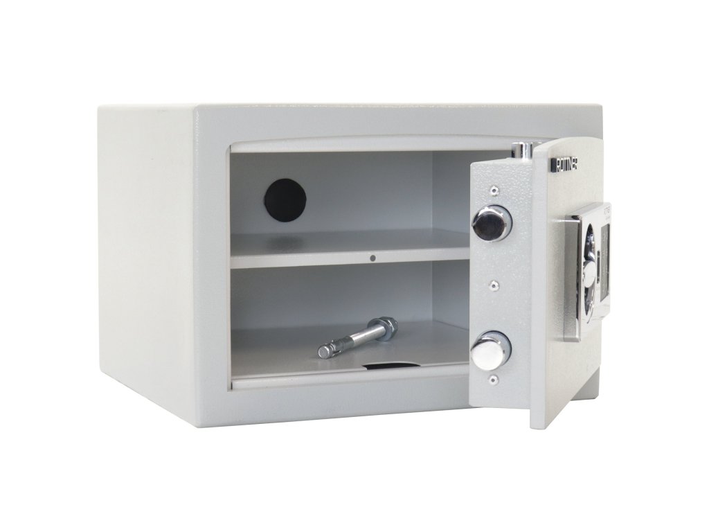 Certifikovaný elektronický zámek Bezpečnostní třída I (ČSN EN 1143-1) Napájení 1 x 9V baterií (není součástí balení) Dvouplášťový trezor Polička