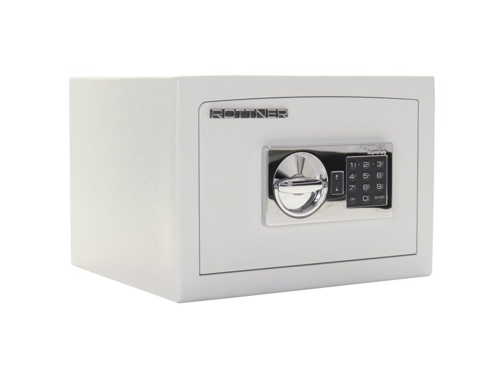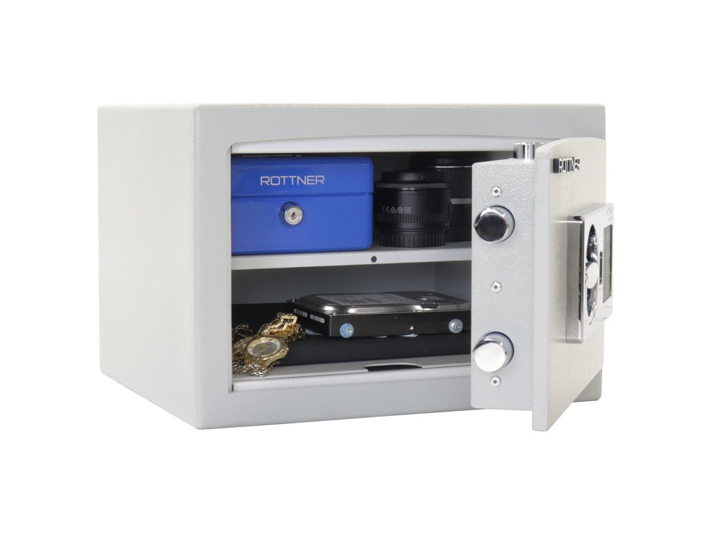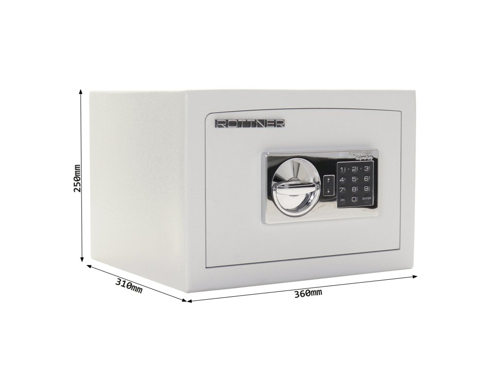 Hlavní výhody: Certifikovaný elektronický zámek Bezpečnostní třída I (ČSN EN 1143-1) Napájení 1 x 9V baterií (není součástí balení) 3-stranný uzamykací mechanizmus Dvouplaštový trezor Otevření dveří až do 90° Polička uvnitř Tloušťka dveří 66 mm Otvory na ukotvení na spodní a zadní straně trezoru Trezor Fifty EL v šedé barvě jsme vytvořili u příležitosti 50. výročí společnosti Rottner. Trezor disponuje certifikovaným elektronickým zámkem napájeným 9V baterií. Má certifikát bezpečnostní třídy I (ČSN EN 1143-1) a v jeho nitru bezpečně uschováte malé cennosti, cestovní doklady nebo dokumenty. Trezor má 3-stranný uzamykací mechanismus a praktickou poličku uvnitř. Dveře nábytkového trezoru Fifty lze otevřít do úhlu 90°. Trezor má otvory k ukotvení na spodní a zadní straně. Materiál na ukotvení je součástí balení. Kování zámku zvyšuje celkovou vnější hloubku trezoru o 15 mm.Doplňkové parametry