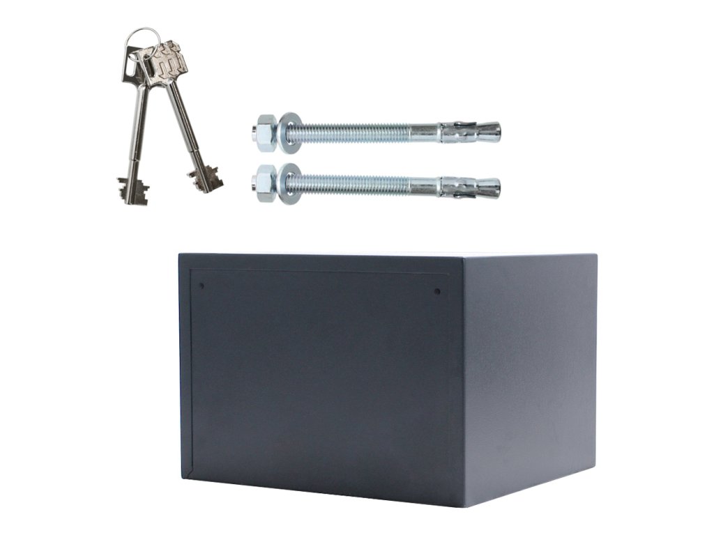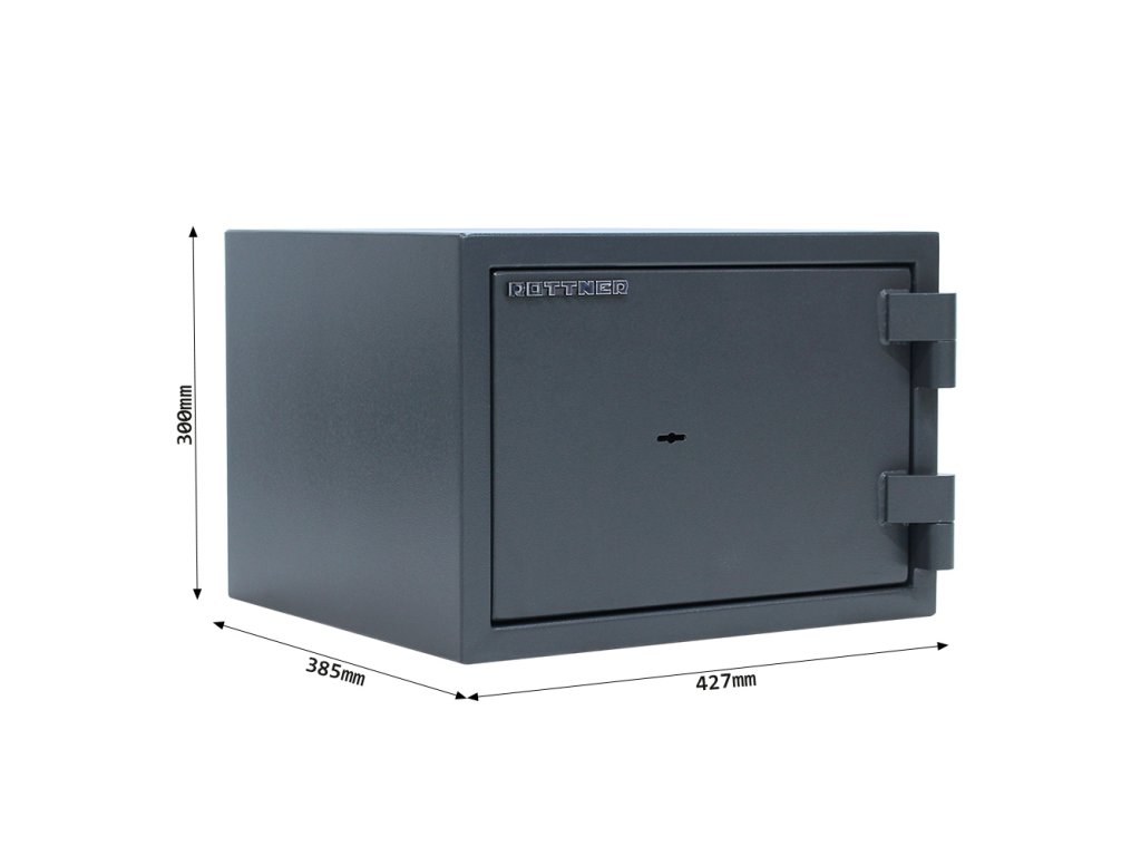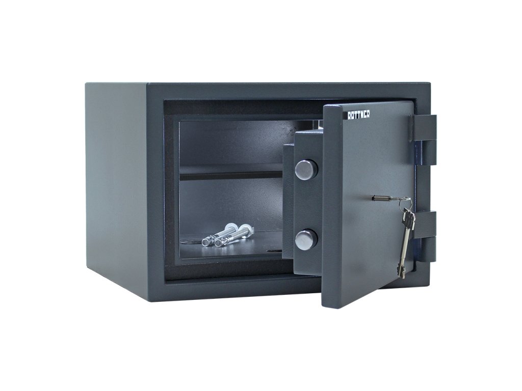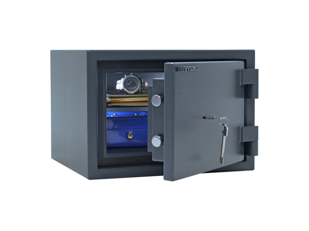 Certifikovaný trezorový zámek s 2 klíči Bezpečnostní třída I (ČSN EN 1143-1) Ohnivzdornost po dobu 30 minut pro papír Nastavitelná polička uvnitř