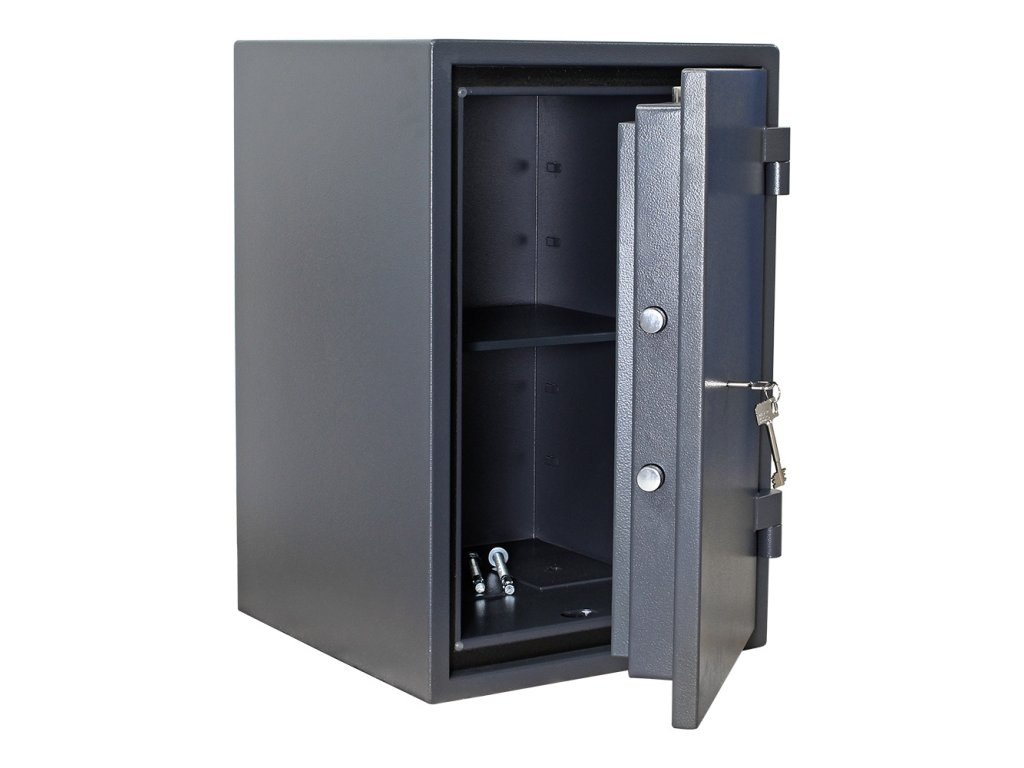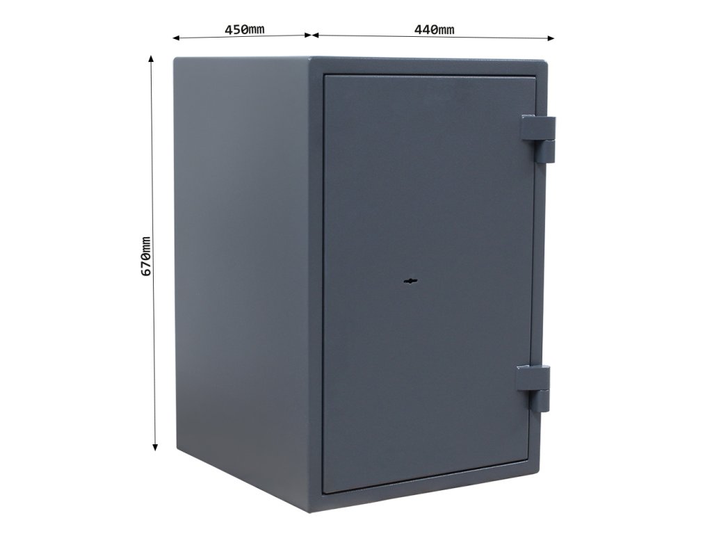 Hlavní výhody: Certifikovaný trezorový zámek Bezpečnostní třída I (ČSN EN 1143-1) Ohnivzdornost po dobu 30 minut pro papír 3-stranný uzamykací mechanizmus Korpus tloušťky 56 mm a dveře tloušťky 95 mm Nastavitelná polička uvnitř Otevření dveří až do 180° Otvory na ukotvení na spodní straně trezoru Ohnivzdorný trezor v provedení antracit z modelové řady Fire Hero má certifikovaný trezorový zámek dodávaný spolu s 2 klíči. Disponuje bezpečnostní třídou I (ČSN EN 1143-1) a vydrží i působení ohně, jelikož má certifikát ohnivzdornosti až po dobu 30 minut pro papírové dokumenty. Dveře trezoru se uzamykají 3-stranným uzamykacím mechanismem a lze je otevřít až do úhlu 180°. Jednoplášťový korpus a dveře tloušťky 95 mm. Uvnitř se nachází nastavitelná polička. Otvory na ukotvení se nacházejí na spodní straně. Kotvící materiál je součástí balení. Kování zámku zvyšuje celkovou vnější hloubku trezoru o 15 mm.Doplňkové parametry
