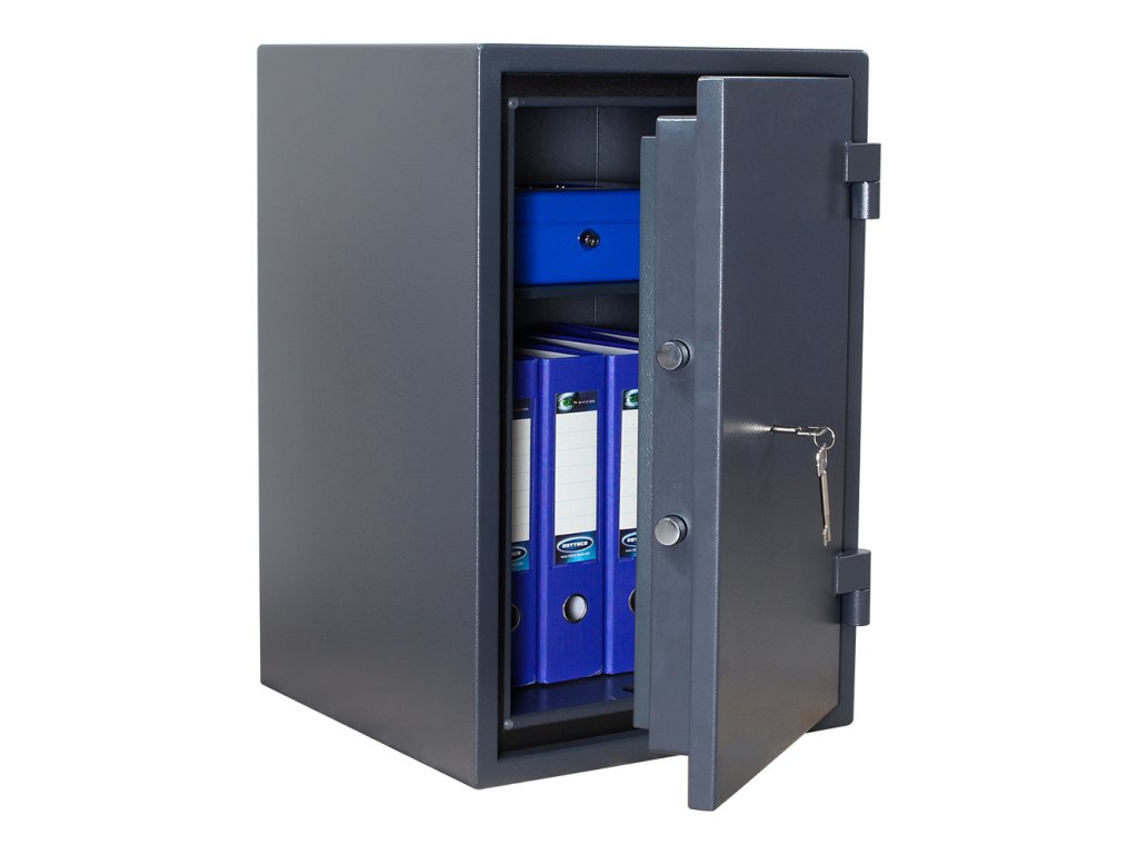 Certifikovaný trezorový zámek Bezpečnostní třída I (ČSN EN 1143-1) Ohnivzdornost po dobu 30 minut pro papír Nastavitelná polička uvnitř