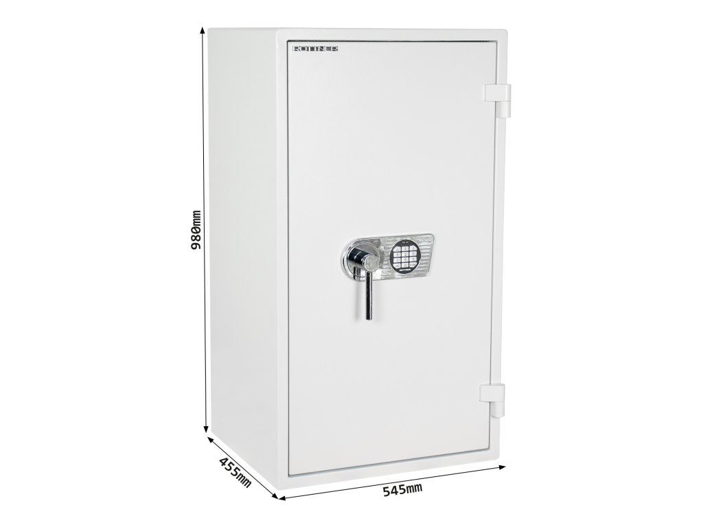Hlavní výhody: Ohnivzdorný trezor v bezpečnostní třídě II. podle EN 1143 Ohnivzdornost po dobu 60 minut pro papírové dokumenty podle LFS-60P Certifikovaný elektronický zámek, 9V, nouzové otevírání externí baterií 9 uživatelských kódů/ Master Code Dočasné zablokování zámku po třech nesprávných zadáních kódu 1 police Vnější rozměry mm: 980x545x455 (+60 mm) pro kovaní zámku Vnitřní rozměry mm: 820x400x295 Váha: 205 kg Objem: 97 L Tloušťka dveří: 90 mm Celková tloušťka dveří: 110 mm Kotvení: 1 otvor ve spodní stěně o průměru 15 mm, instalační materiál je součástí dodávky. Barva: světle šedá Otevření dveří až do 180°Doplňkové parametry