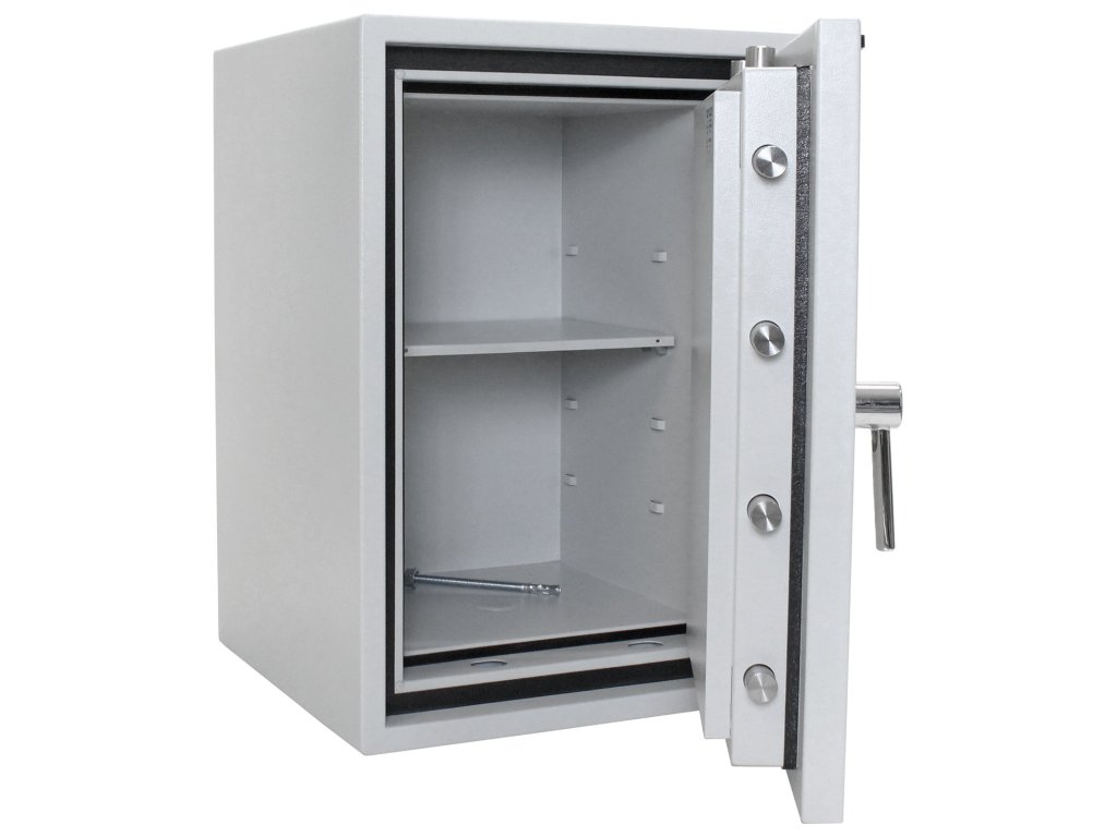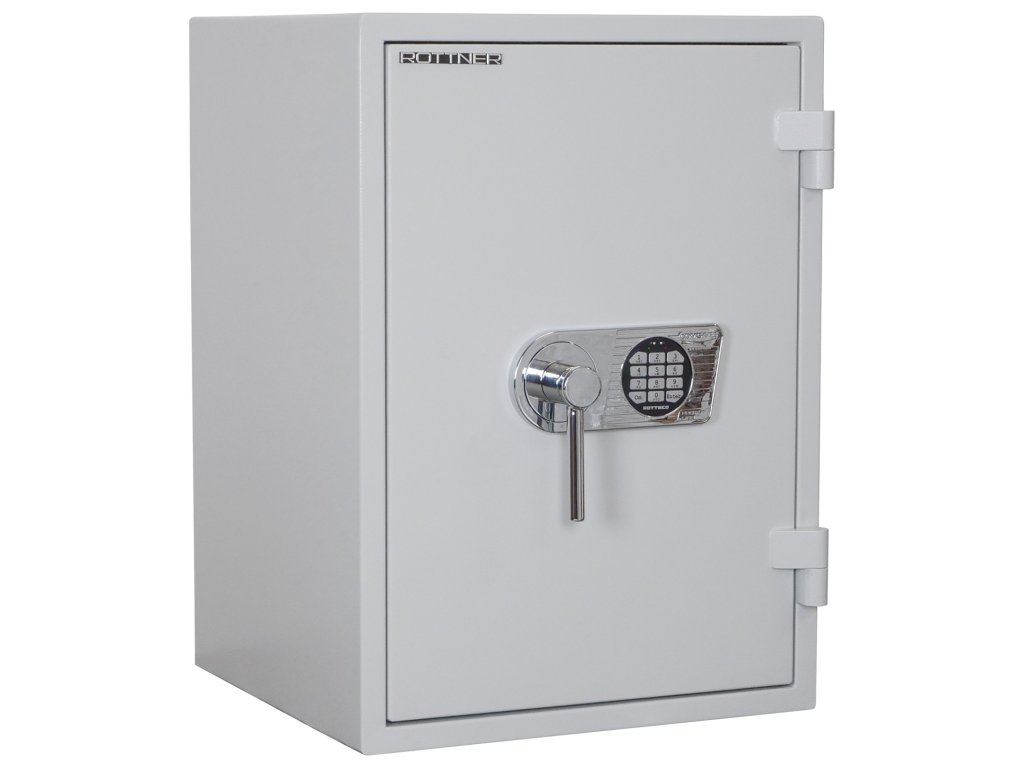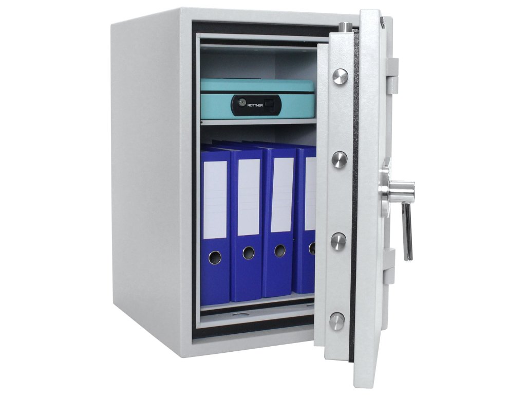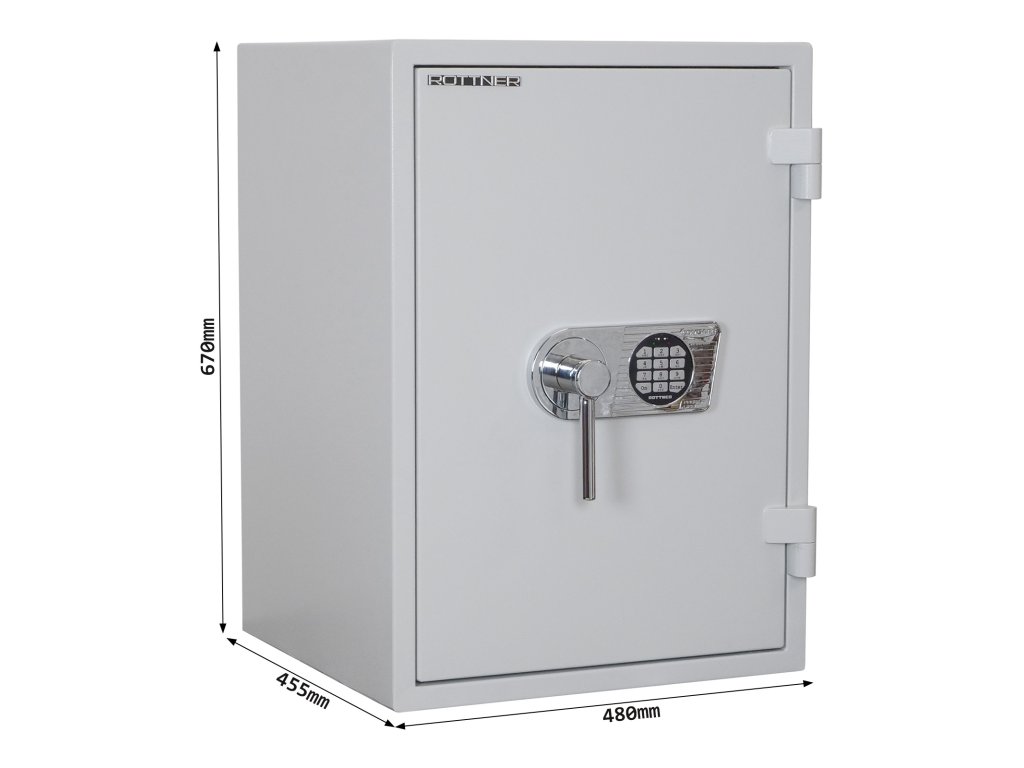 Certifikovaný elektronický zámek (ČSN EN 1143) Bezpečnostní třída II Ohnivzdornost po dobu 60 minut pro papír Napájení 1 x 9V baterií (není součástí balení) Hlavní a 9 vedlejších kódů Polička uvnitř