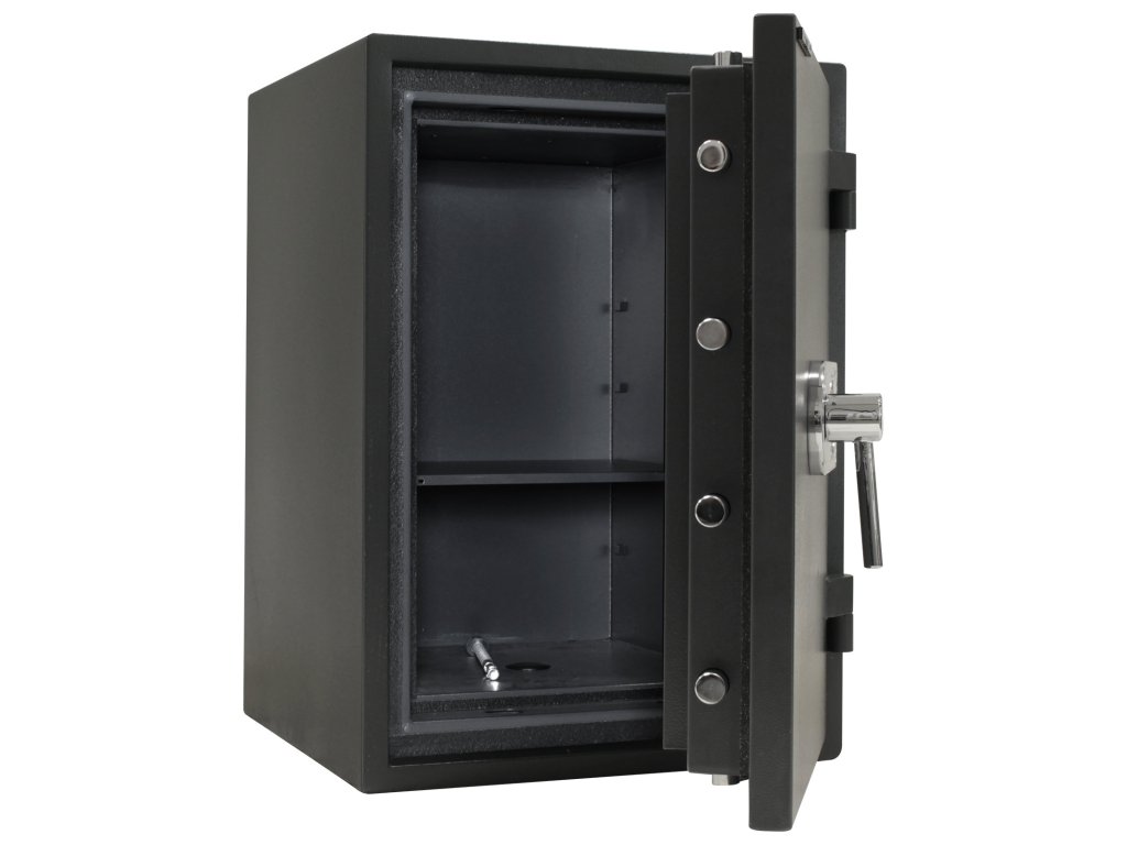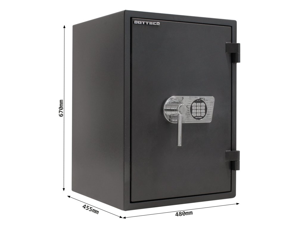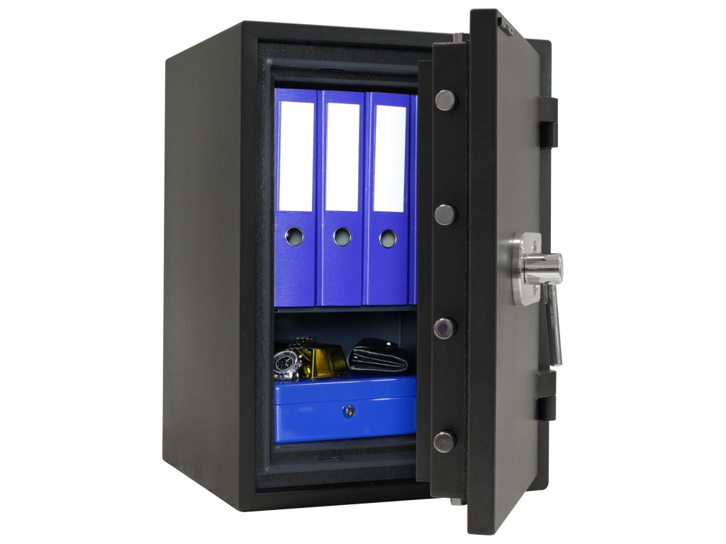 Certifikovaný elektronický zámek Bezpečnostní třída I (ČSN EN 1143-1) Napájení 1 x 9V baterií (není součástí balení) Ohnivzdornost po dobu 60 minut pro papír Polička uvnitř Možnost doplňkové výbavy
