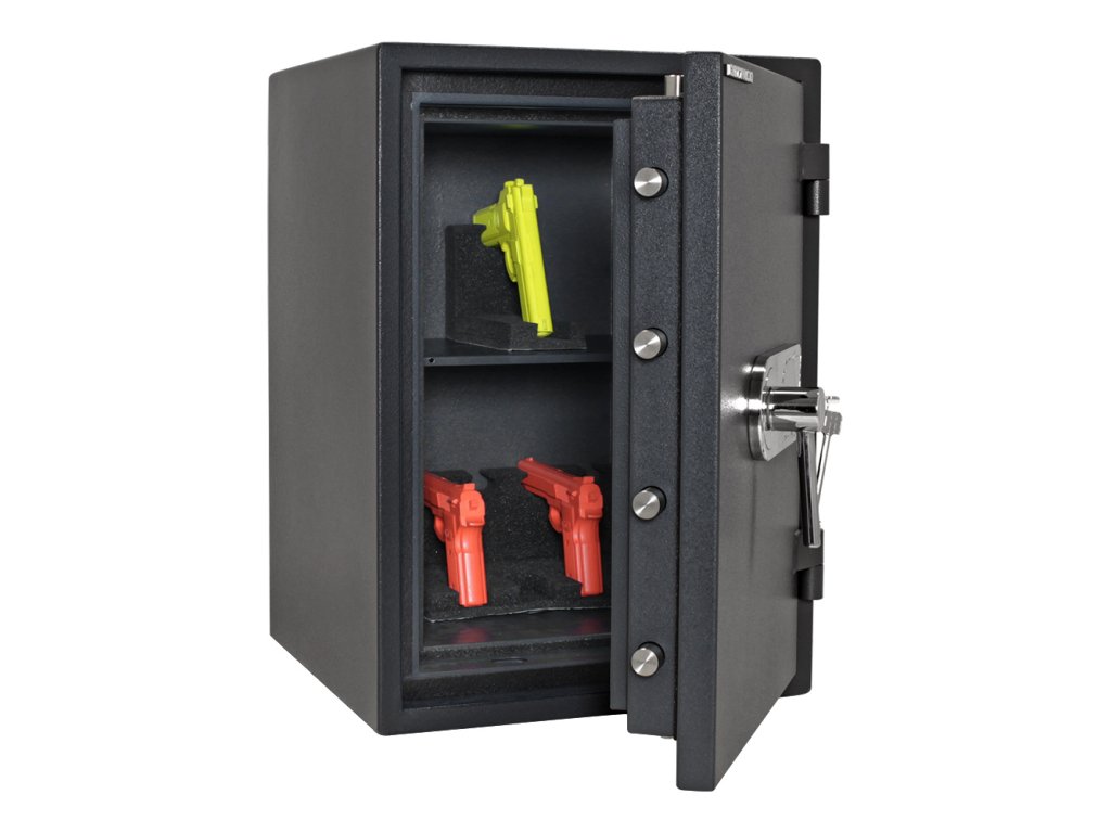 Hlavní výhody: Certifikovaný trezorový zámek Bezpečnostní třída I (ČSN EN 1143-1) Ohnivzdornost po dobu 60 minut pro papír Možnost úschovy i zbraní a munice podle č. 190/2003 Sb. z. 3-stranný uzamykací mechanizmus Betonová výplň Otevření dveří až do 180 ° Polička uvnitř Možnost doobjednání teleskopických polic Možnost doobjednání teleskopické registratury Otvory na ukotvení na spodní straně trezoru Nábytkový ohnivzdorný trezor z modelové rodiny Fire Profi nabízí výbornou možnost, jak bezpečně uschovat cennosti, šperky, šanony nebo i zbraně a munici. Trezor má trezorový zámek spolu s 2 klíči a certifikát bezpečnostní třídy I (ČSN EN 1143-1). Velkou výhodou je ohnivzdornost, přičemž trezor odolá ohni až po dobu 60 minut. Dveře trezoru mají tloušťku 105 mm a uzamkýnajú se pomocí 3-stranného uzamykacího mechanismu. Mezi jednolivé plášti se nachází speciální betonová výplň, která zaručuje odolnost trezoru proti ohni. Dveře otevřete opravdu dostatečně na pohodlné vyjmutí uložených věcí. Zároveň se uvnitř nachází i polička. Potěší možnost doobjednání doplňkové výbavy. Spodní strana trezoru disponuje otvory pro ukotvení. Kotvící materiál je součástí balení. Kování zámku zvyšuje celkovou vnější hloubku trezoru o 60 mm.Doplňkové parametry
