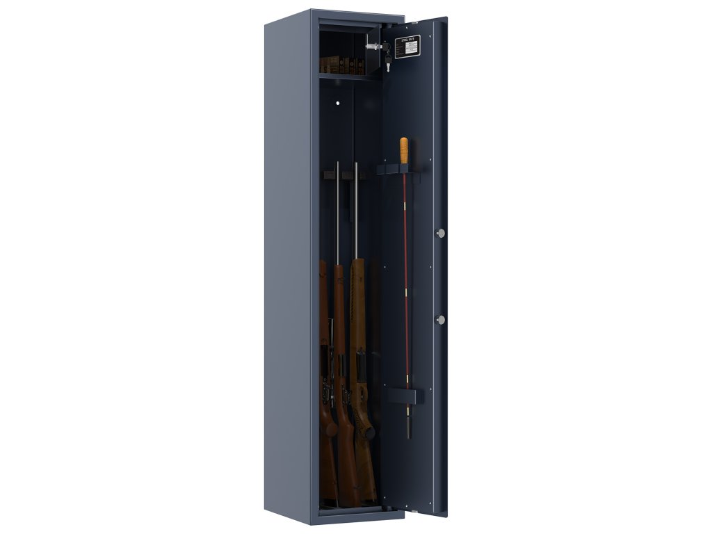 Bezpečnostní třída S1 (ČSN EN 14450) Minimálně 15 RU (ČSN EN 1143-1) Zámek chráněn proti provrtání Až pro 5 dlouhých zbraní Malá uzamykatelná skříňka uvnitř