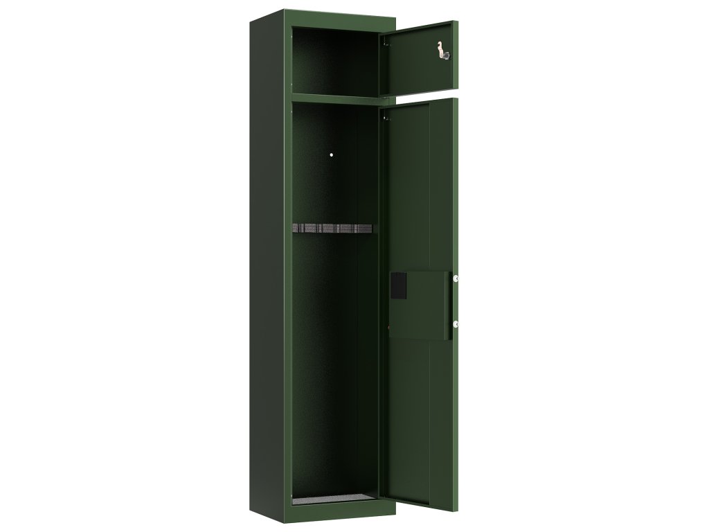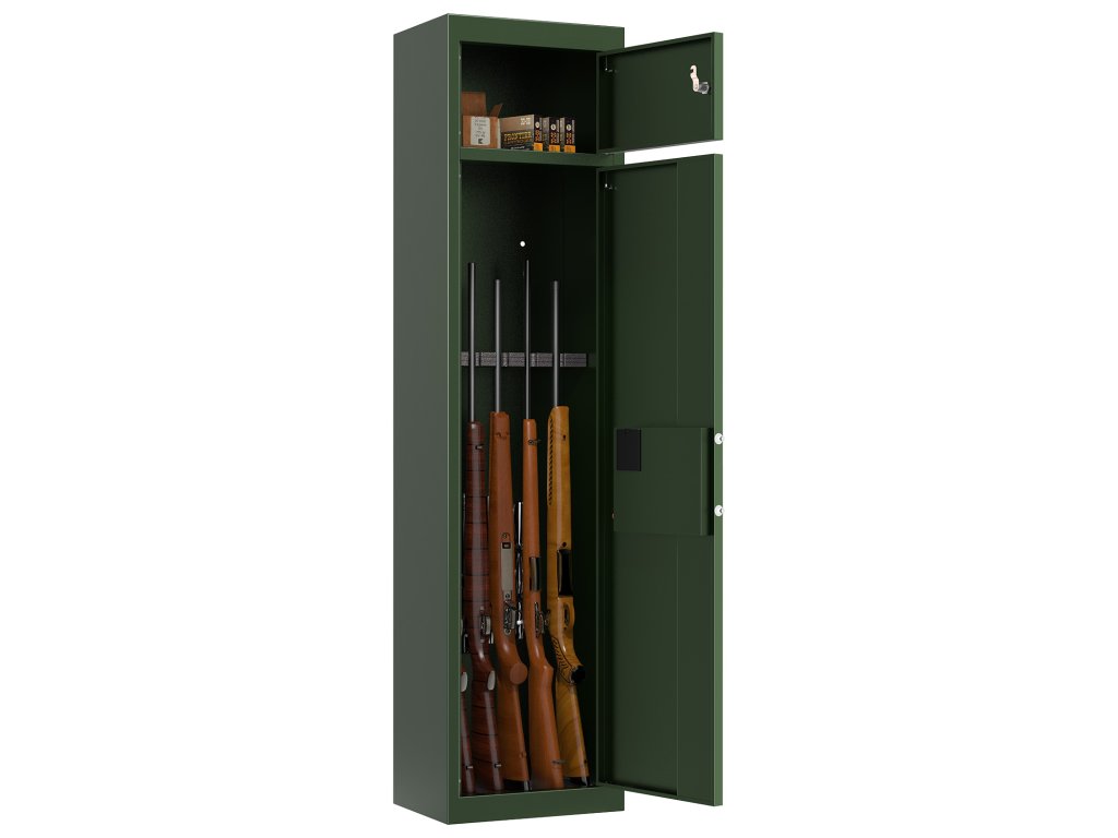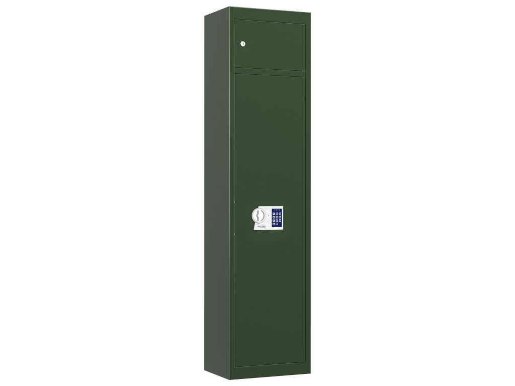 Hlavní výhody: Elektronický zámek Vhodná pro 5 dlouhých zbraní Napájení 4 x 1,5V AA baterií (nejsou součástí balení) Odolnější obal Cargo Držák na dveřích pro nářadí na čištění zbraní Vnitřní schránka s cylindrickým zámkem a 2 klíči Mechanické nouzové otevírání s cylindrickým zámkem a 2 klíči Otvory na ukotvení na spodní i zadní části skříně Zelená skříň na zbraně z modelové řady Gun s přívlastkem Cargo je zabalena v odolnějším obalu, aby vydržela i náročnější přepravu. Disponuje elektronickým zámkem a je ideální pro uschování 5 dlouhých zbraní. Klávesnice a elektornický zámek jsou napájeny 4 x 1,5V AA bateriemi. Dveře skříně na zbraně Gun 5 Cargo je vybaven praktickým držákem na dveřích pro nářadí a čistící potřeby na zbraně. Pro uložení drobných věcí nebo munice slouží vnitřní schránka v horní části skříně, kterou lze samostatně uzamknout. V případě vybití baterie je možné skříň otevřít pomocí mechanického nouzového otevírání. Otvory na ukotvení se nacházejí na spodní a zadní části skříně. Kotvící materiál je součástí balení. Splňuje podmínky dle zákona č. 119/2002 Sb. o zbraních a střelivu.Doplňkové parametry