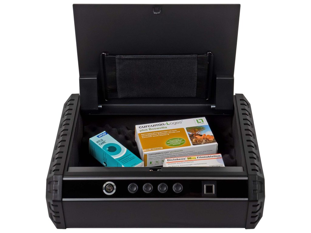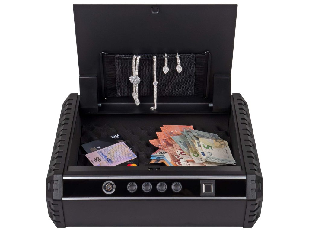 Hlavní vyhody: Kombinovaný zámek s různými možnostmi Otevření pomocí číselné kombinace Otevření pomocí otisku prstu Otevření pomocí nouzového klíče Možnost uložení až 20 otisků Napájení 4 x 1,5V AA bateriemi (nejsou součástí balení) Vhodná pro 2 krátké zbraně a drobné cennosti Měkké polstrování Kompaktní kazeta na uschování krátkých zbraní nebo menších cenností, šperků či menšího obnosu hotovosti. Jedinečností kazety je možnost zvolit si, jak uschované věci ochráníte. Můžete kazetu zamknout díky otisku prstů, číselné kombinace nebo pomocí nouzového klíče. V paměti kazety je možné uložit až 20 různých otisků prstů. Kvalitní ocelová konstrukce zvyšuje odolnost a zároveň bezpečnost kazety. Potěší vnější potažení gumou a vnitřek potaženy měkkým postrování. V případě potřeby je možné kazetu upevnit pomocí přiloženého kotvícího materiálu. Pro tuto schránku na zbraně je stanoveno, že při přechovávání krátkých zbraní do počtu 2 ks nebo do 500 ks nábojů plati prohlášení o shodě.Doplňkové parametry