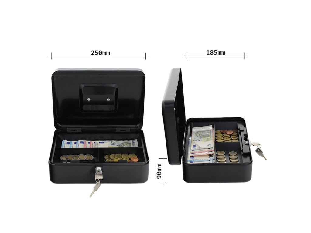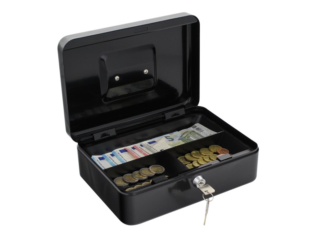 Hlavní výhody: Cylindrický zámek s 2 klíči Vhodná pro mince i bankovky Kvalitní ocelový plech a zapuštěná rukojeť Větší z pokladniček série Homestar Cash nabízí štědrý prostor pro všechny vaše bankovky a mince. Plastové přihrádky pomohou s organizací a zlepší přehled o obsahu pokladničky. Pozinkovaná ručka pro lepší přenos lze zároveň sklopit, aby nebránila v pohodlném používání. Kasičku dodáváme zabalenou ve fólii.Doplňkové parametry