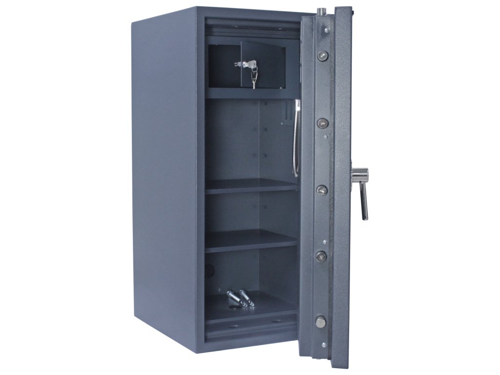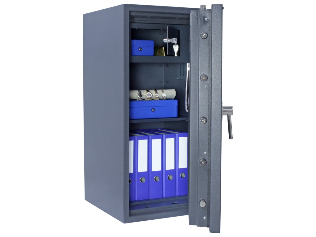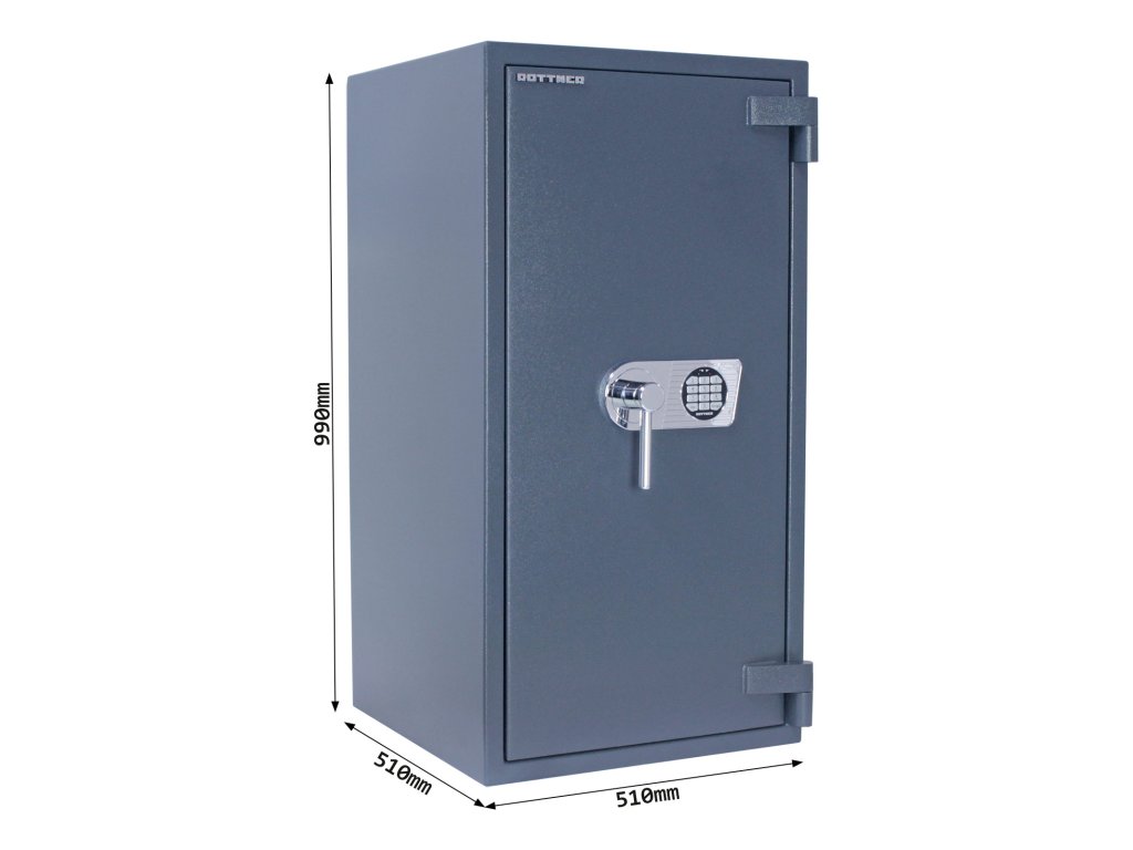 Certifikovaný elektronický zámek Bezpečnostní třída III (ČSN EN 1143-1) Ohnivzdornost po dobu 30 minut pro papír Napájení 1 x 9V baterií (není součástí balení) Vnitřní schránka a 2 poličky