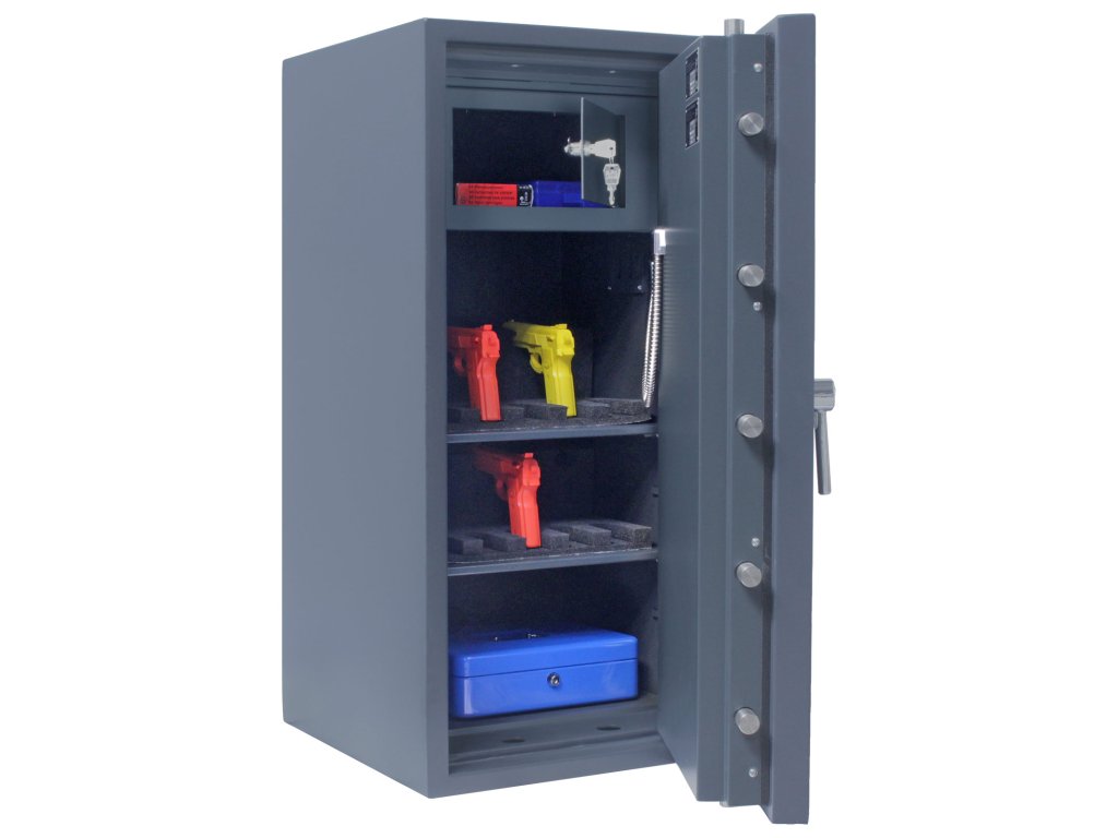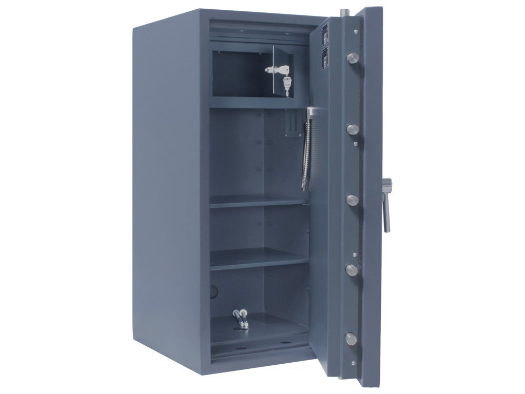 Certifikovaný trezorový zámek Bezpečnostní třída III (ČSN EN 1143-1) Ohnivzdornost po dobu 30 minut pro papír Napájení 1 x 9V baterií (není součástí balení) Vnitřní schránka a 2 poličky
