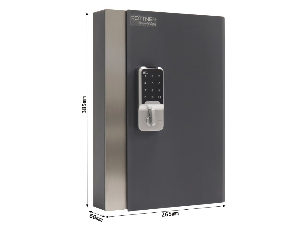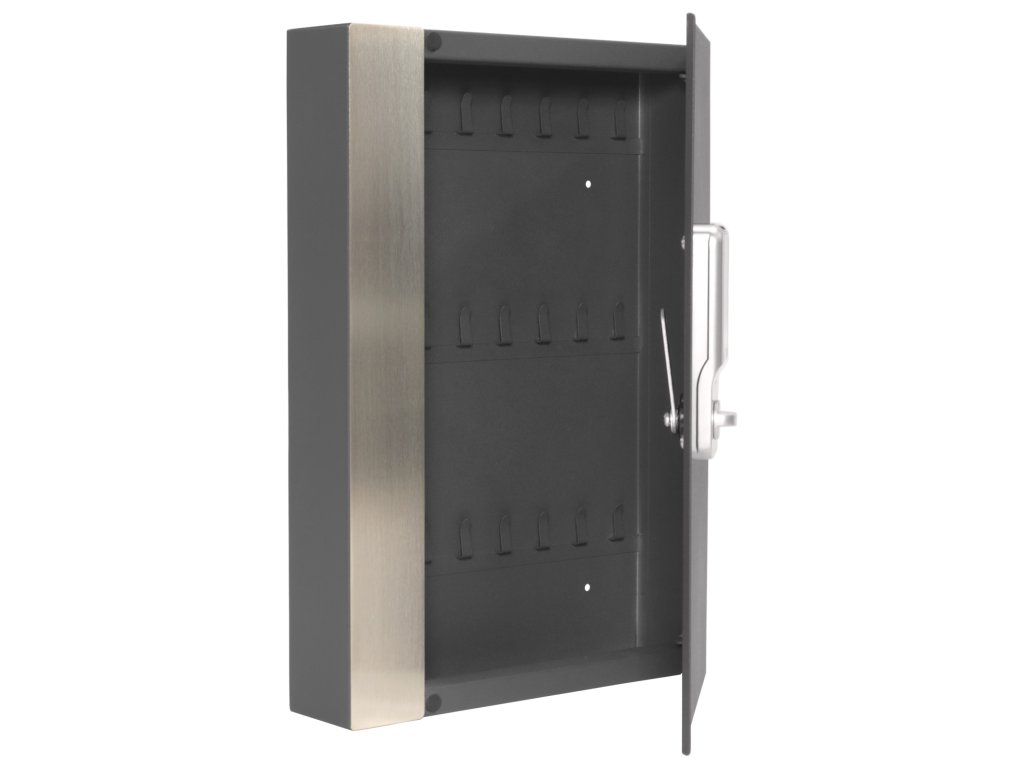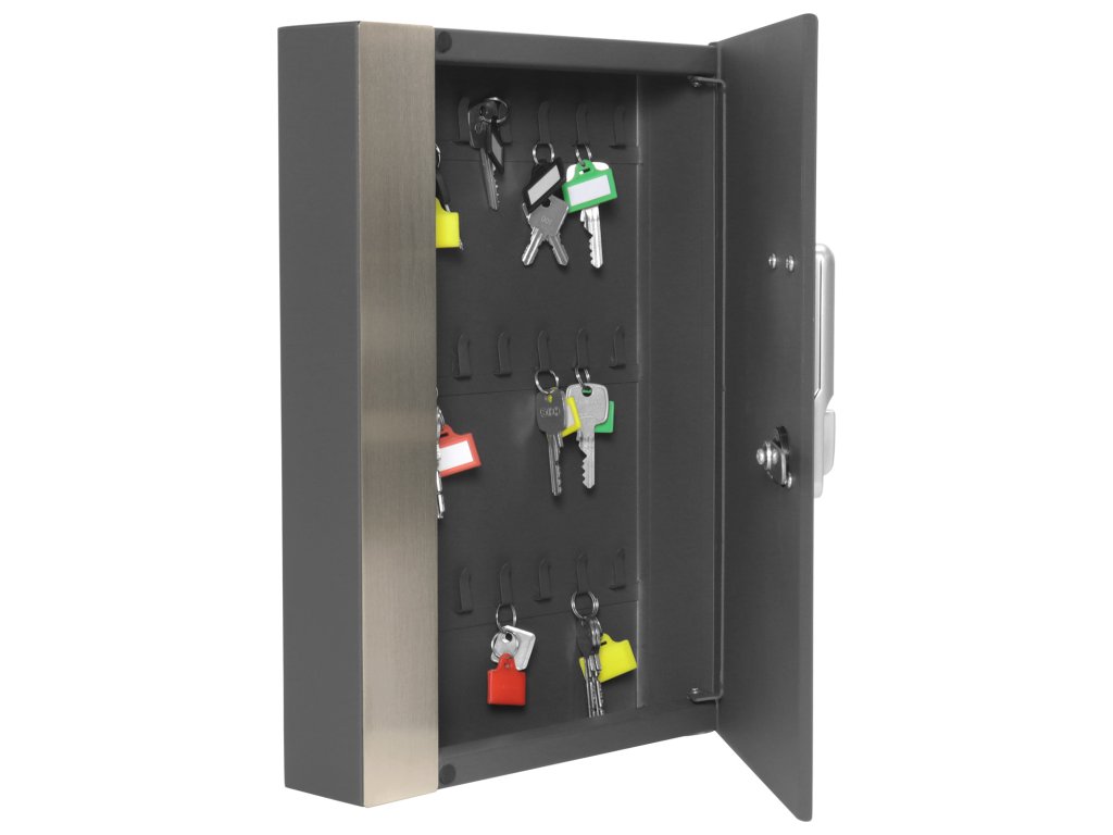 Hlavní výhody: Elektronický zámek Napájení 4 x 1,5V bateriemi (nejsou součástí balení) Celkově 24 háčků Jednoplášťový korpus Pevný umístěna lišta s háčkem Pozinkovaný korpus Skříňka na klíče s modelovým označením Key Home 24 disponuje elektronickým zámkem. Zámek spolu s klávesnicí pro zadávání kódu jsou napájeny 4 x 1,5V bateriemi (nejsou součástí balení). Uvnitř se nacházejí fixně umístěny lišty s celkově 24 pozinkovanými háčky, na které si můžete uložit klíče. Skříňka má standardní jednoplášťový korpus a dveře lze otevřít do úhlu 90°. Zadní strana má připravené otvory na upevnění. Materiál na upevnění je součástí balení.Doplňkové parametry