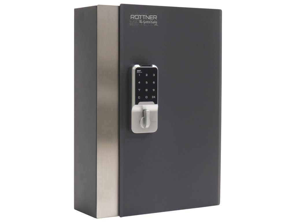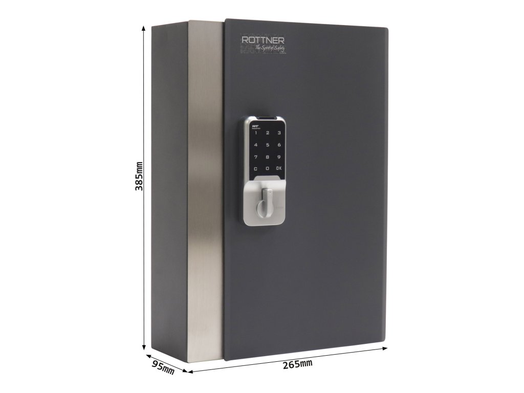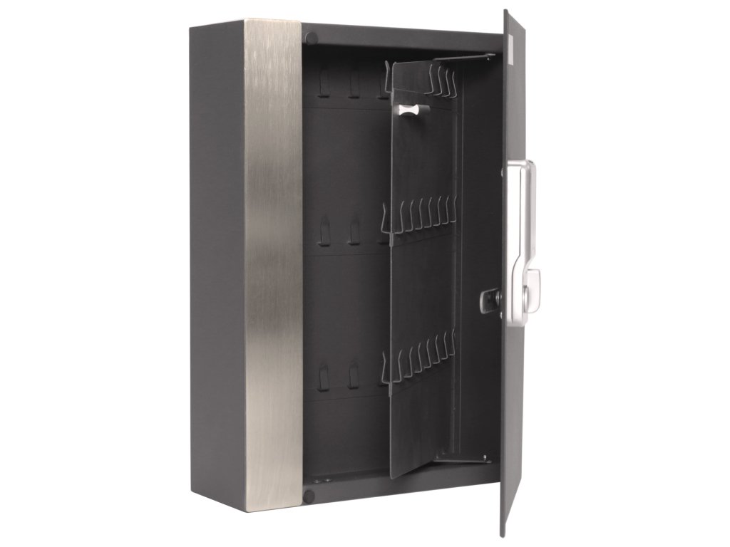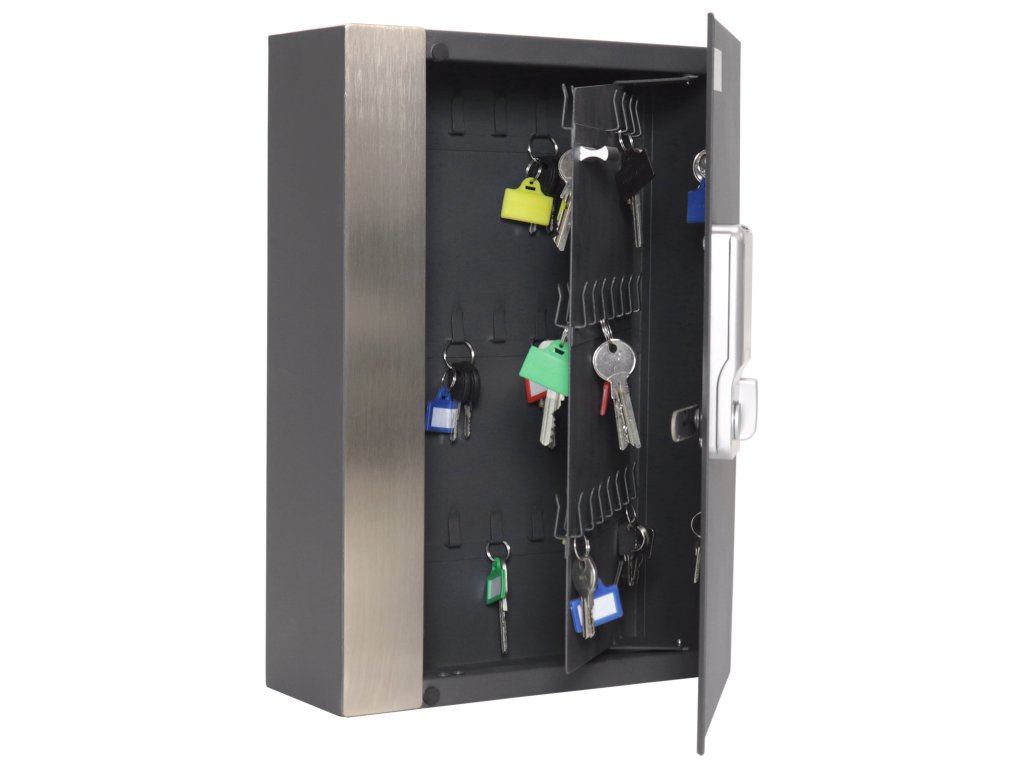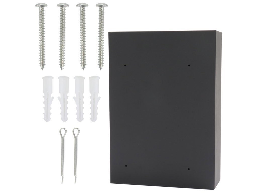 Hlavní výhody: Elektronický zámek Napájení 4 x 1,5V bateriemi (nejsou součástí balení) Celkově 68 háčků Jednoplášťový korpus Pevný umístěna lišta s háčkem Pozinkovaný korpus Skříňka na klíče s modelovým označením Key Home 68 disponuje elektronickým zámkem. Zámek spolu s klávesnicí pro zadávání kódu jsou napájeny 4 x 1,5V bateriemi (nejsou součástí balení). Uvnitř se nacházejí fixně umístěny lišty s celkově 68 pozinkovanými háčky, na které si můžete uložit klíče. Skříňka má standardní jednoplášťový korpus a dveře lze otevřít do úhlu 90°. Zadní strana má připravené otvory na upevnění. Materiál na upevnění je součástí balení.Doplňkové parametry