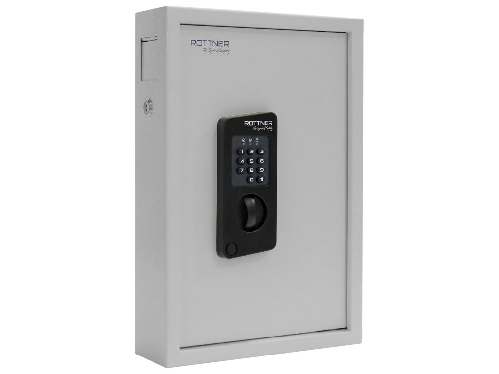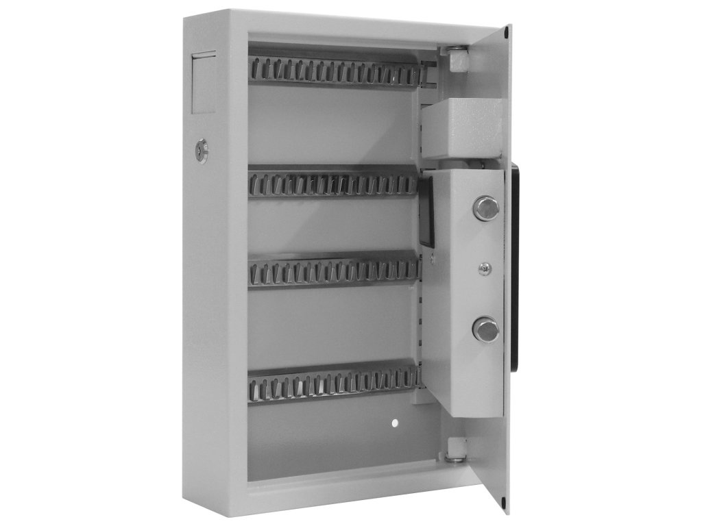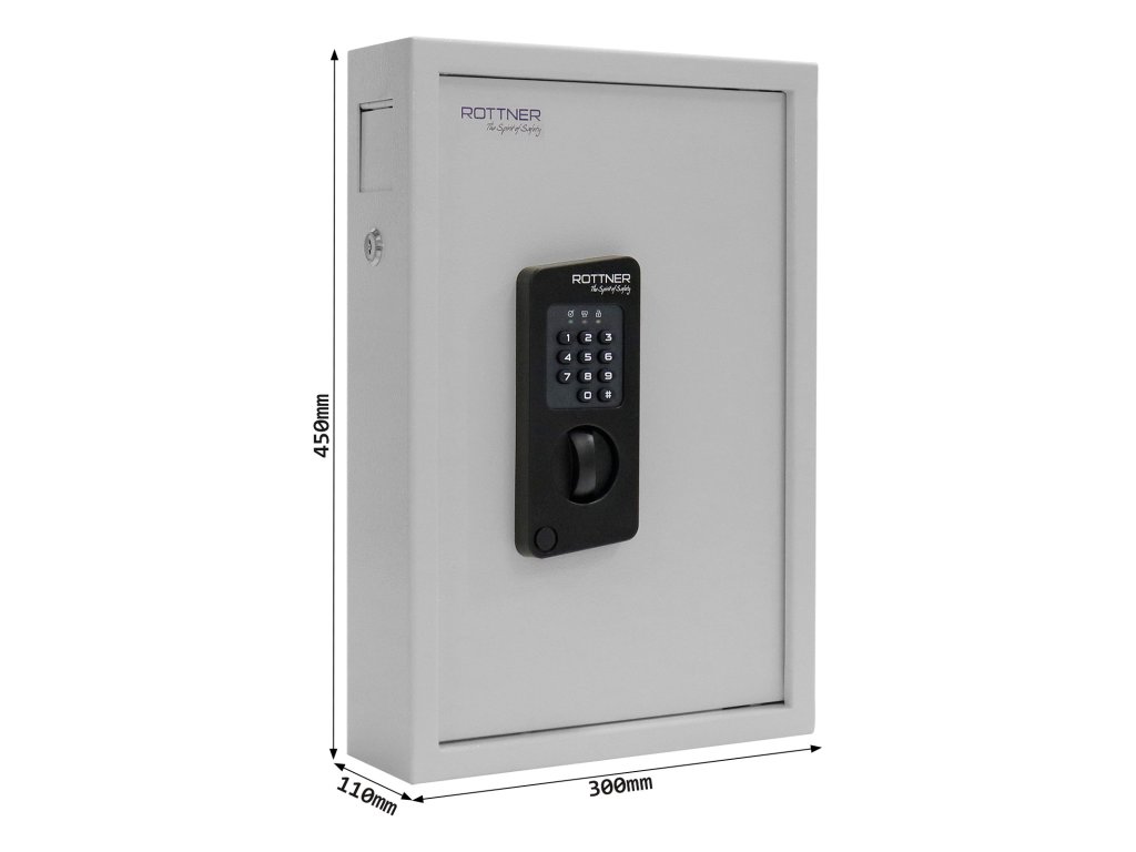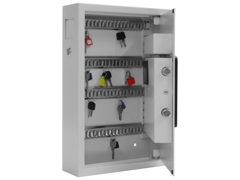 Hlavní výhody: Elektronický zámek s 2 klíči Velká klávesnice s možností zadání až 8-místného kódu Celkově až 100 milionů kombinací Boční vhod pro vrácení klíči Celkově 48 háčků Jednoplášťové provedení Napájení 4 x 1,5 V AA bateriemi (nejsou součástí) Mechanické nouzové otevírání s cylindrickým zámkem a 2 klíči V balení 48 barevných visačok Šedý sejf na klíče z modelové řady Keytronic nabízí prostor pro 48 klíčů, které přehledně můžete umístit na háčky uvnitř sejfu. Háčky jsou fixně umístěny na lištách, které můžete svisle posouvat. Přehledná klávesnice umožňuje zadat až 8-místný kód s celkem až 100 miliony možných kombinací. Zámek je napájen 1,5V AA bateriemi, které v případě vybití nahradí přiložen nouzový klíč. Obrovskou výhodou sejfu je vhodzový otvor na levé straně, pomocí kterého vrátíte klíč do sejfu bez nutnosti zadávat heslo a sejf otevírat. Sejf na klíče jednoduše připevníte na stěnu přes připravené otvory na zadní straně. Potřebný kotvící materiál je součástí dodávky.Doplňkové parametry