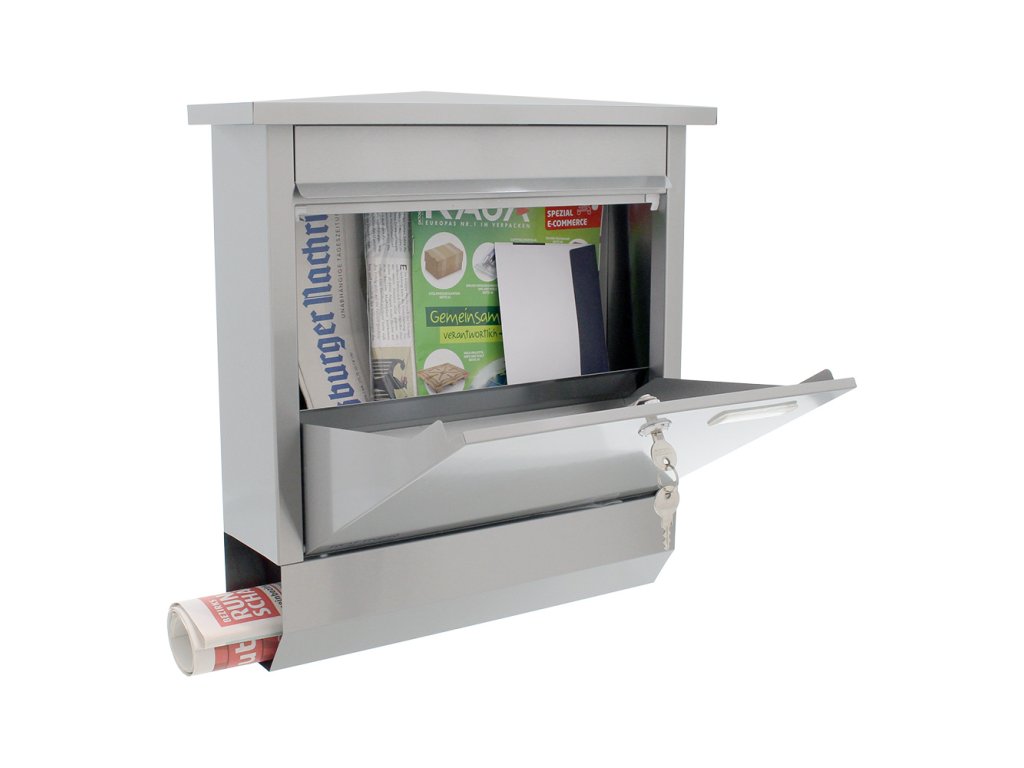Hlavní výhody: Cylindrický zámek se 2 klíči Horní vhod pro poštu Samostatný box na noviny Jmenovka Nerezová poštovní schránka Lettero disponuje klasickým cylindrickým zámkem dodávaným s 2 klíči. Pro vhození pošty slouží horní vhod, který je chráněn krytkou. Dovnitř tak nepronikne dešťová voda a ani jiné nečistoty, které by mohly poškodit uloženou poštu. Na spodní straně se nachází samostatný box, který je určen pro příjem denního tisku a novin. Na přední straně se nachází místo na jmenovku. Zadní strana poštovní schránky má připravené otvory pro upevnění na stěnu, zeď nebo fasádu domu. Materiál na ukotvení je součástí balení.Doplňkové parametry