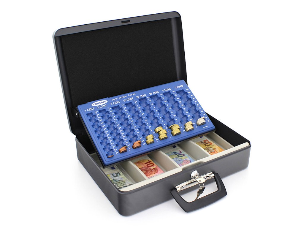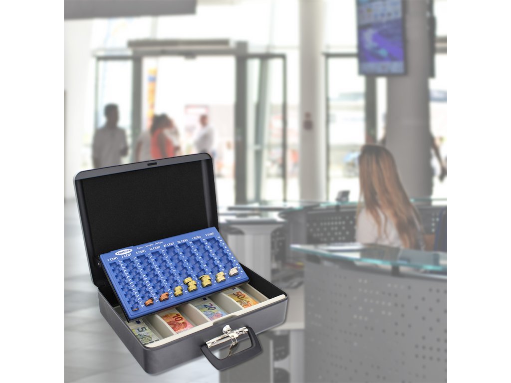 Hlavní výhody: Cylindrický zámek se 2 klíči Možnost použít jako kufřík Plastový mincovník pro euromince Plastové přihrádky pro eurobankovky Horní a boční rukojeť Kvalitní ocelové provedení Objevte přednosti europokladničky, které v sobě spojuje výhody klasické europokladničky a kompaktního kufříku. Uschovejte menší obnos peněz v pokladničce, která se po zavření může používat i jako kufřík. Po otevření europokladničky se automaticky vysune spolu s věkem i plastový mincovník. Disponuje 8 radami pro euromince, od 1 centových až po 2 eurové. Pod mincovníkem se skrývají 4 plastové přihrádky pro eurobankovky. Po zavření víka můžete europokladničku přenášet buď jako kufřík nebo klasicky jako pokladničku za pomoci horní rukojeti.Doplňkové parametry