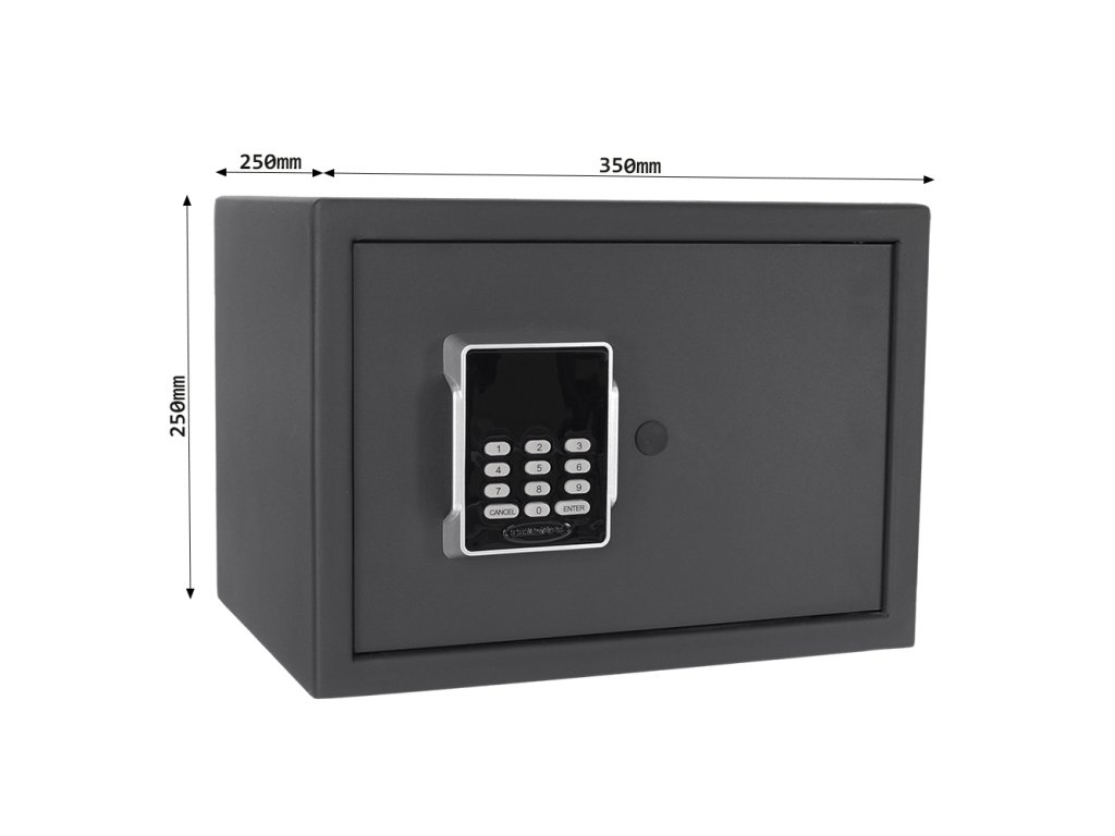 Elektronický zámek Zámek se sjednoceným klíčem Možnost nastavení 2 kódů (tzv. master a user kód) Napájení 4 x 1,5V bateriemi (nejsou součástí balení) Pro objednání sejfu se sjednoceným klíčem je nutno objednat 2 a více kusů.