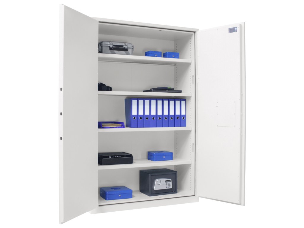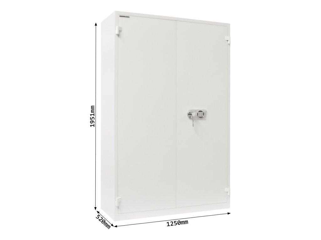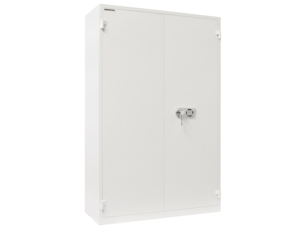 Hlavní výhody: Certifikovaný elektronický zámek Napájení 1 x 9V baterií (není součástí balení) Speciální výplň mezi stěnami Dvouplášťová konstrukce Nastavitelné 4 poličky uvnitř 3-stranný uzamykací mechanizmus Otevírání dveří až do 180° Možnost doobjednání registratury Možnost doobjednání teleskopické police Elektronické nouzové otevírání externí baterií Otvory na ukotvení na spodní a zadní straně skříně Archivační skříň Office 4 EL Premium nabízí bezpečný elektronický zámek doplněn vnějšími kontakty pro přiložení náhradní baterie v případě vybití té původní. Zámek je napájen klasickou 9V baterií. Dvouplášťová konstrukce skříně v sobě ukrývá speciální výplň, která pomůže při vysokých teplotách v okolí, způsobených menším požárem. Pro pohodlný přístup k uloženým dokumentům a šanony lze dveře skříně otevřít až do 180°. Po zavření se dveře uzamknou 3-stranným mechanismem. Uvnitř se nacházejí 4 nastavitelné poličky. Vnitřek si tak uspořádáte podle svých potřeb. Zároveň je možné doobjednat doplňkovou výbavu. Spodní a zadní strana má připravené otvory pro ukotvení. Kotvící materiál je součástí balení. Kování zámku zvyšuje celkovou vnější hloubku skříně o 60 mm.Doplňkové parametry