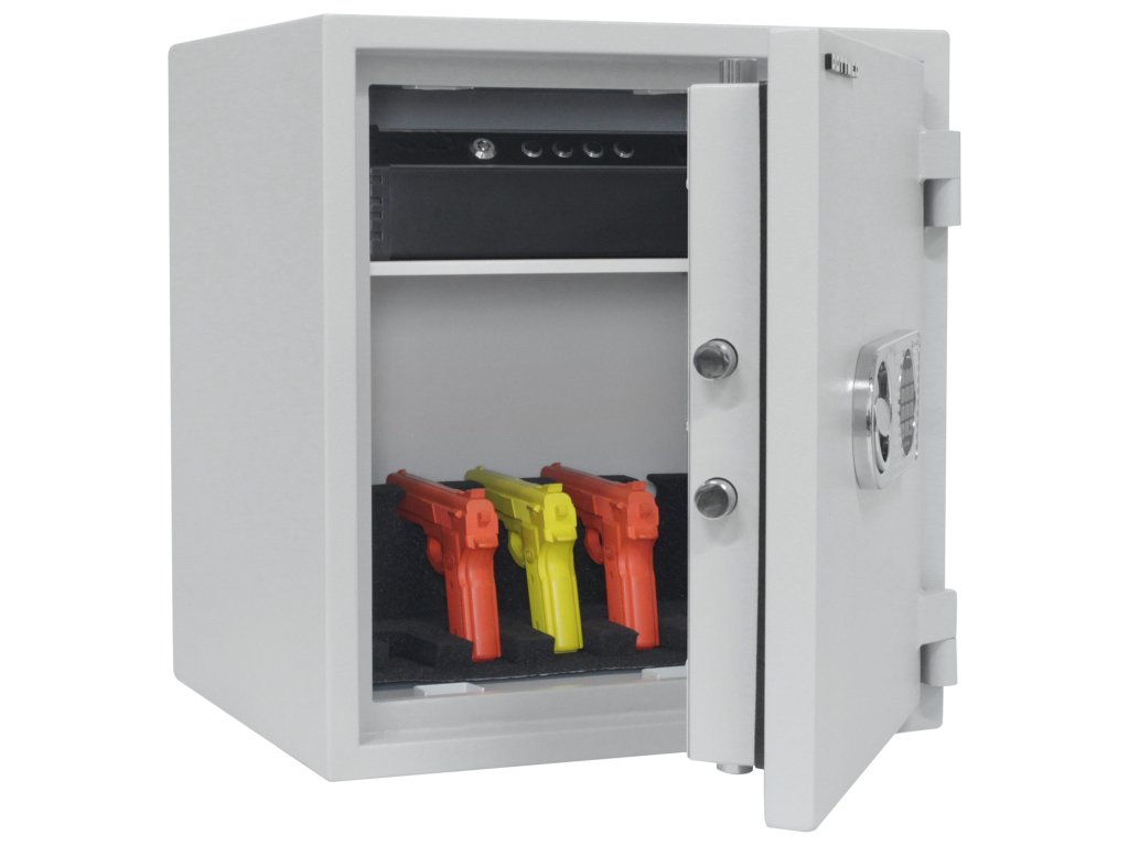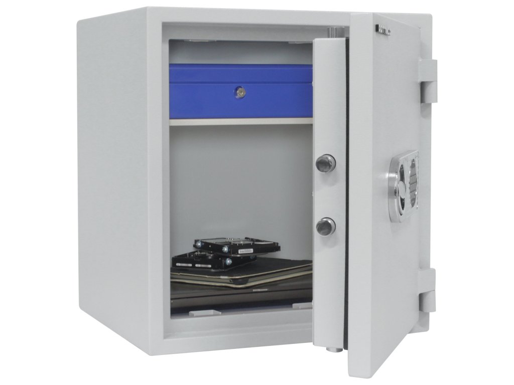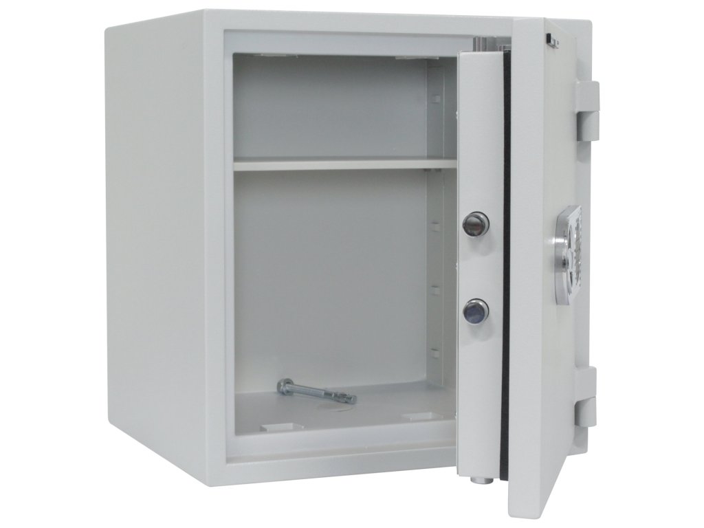Certifikovaný elektronický zámek Bezpečnostní třída I (ČSN EN 1143-1) Ohnivzdornost po dobu 30 minut pro papír Napájení 1 x 9V baterií (není součástí balení) Polička uvnitř