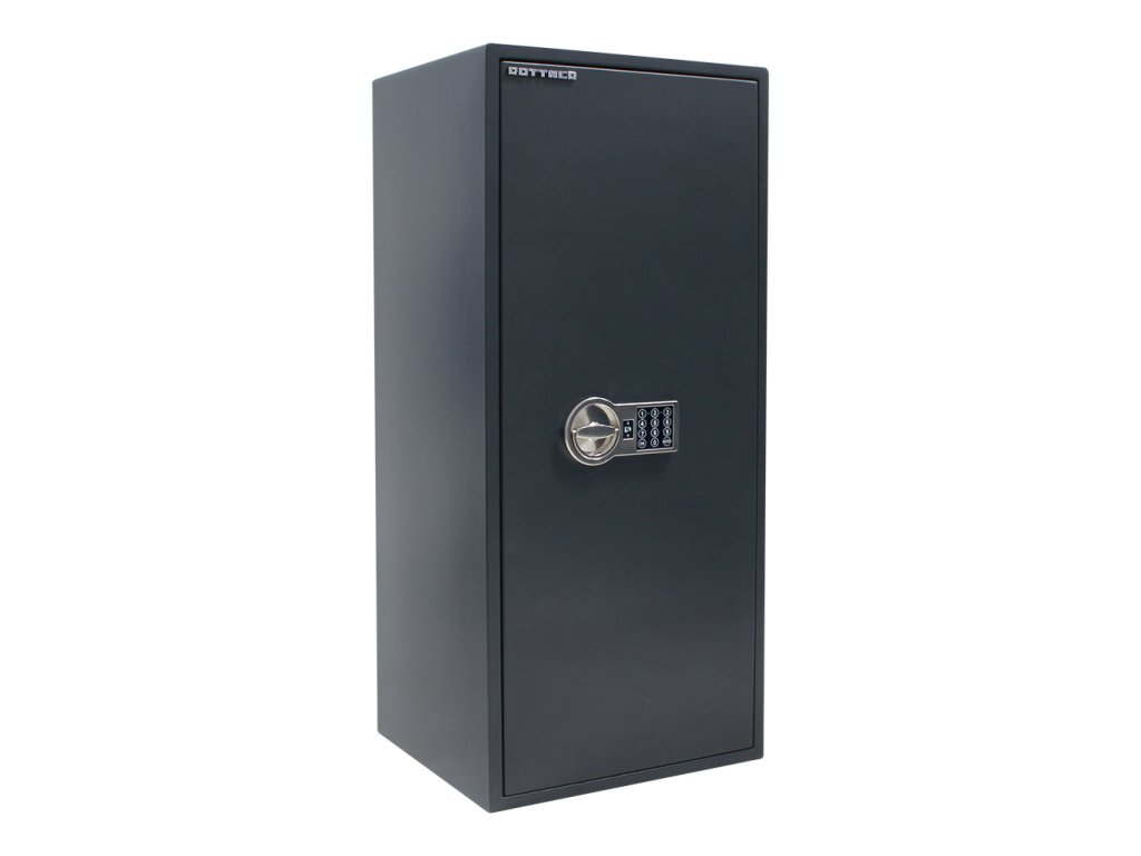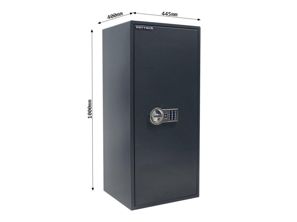 Certifikovaný elektronický zámek Bezpečnostní třída S2 (ČSN EN 14450) Vnitřní schránka a 2 poličky Napájení 1 x 9V baterií (součástí balení)