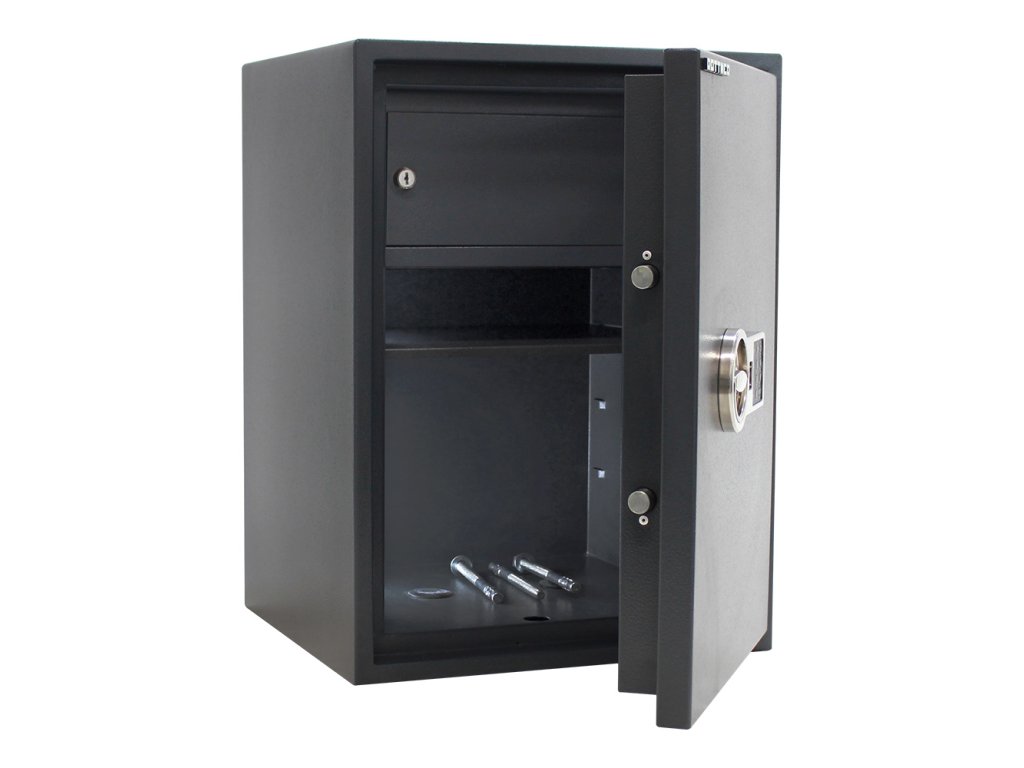 Certifikovaný elektronický zámek Bezpečnostní třída S2 (ČSN EN 14450) Uzamykatelná vnitřní schránka a polička Napájení 1 x 9V baterií (součástí balení) Možnost uschování zbraní a munice