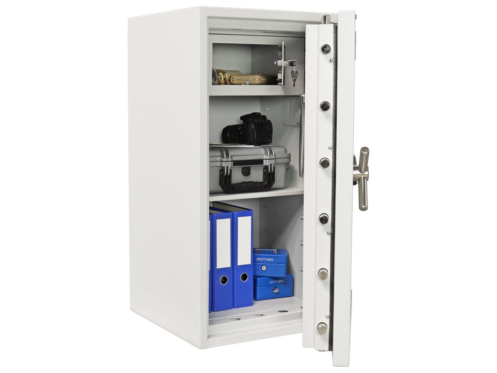 Certifikovaný klíčová a elektronický zámek Bezpečnostní třída IV (ČSN EN 1143-1) Napájení 1 x 9V baterií (není součástí balení) Ohnivzdornost po dobu 30 minut pro papír Příprava pro EMA Vnitřní schránka a 2 poličky uvnitř