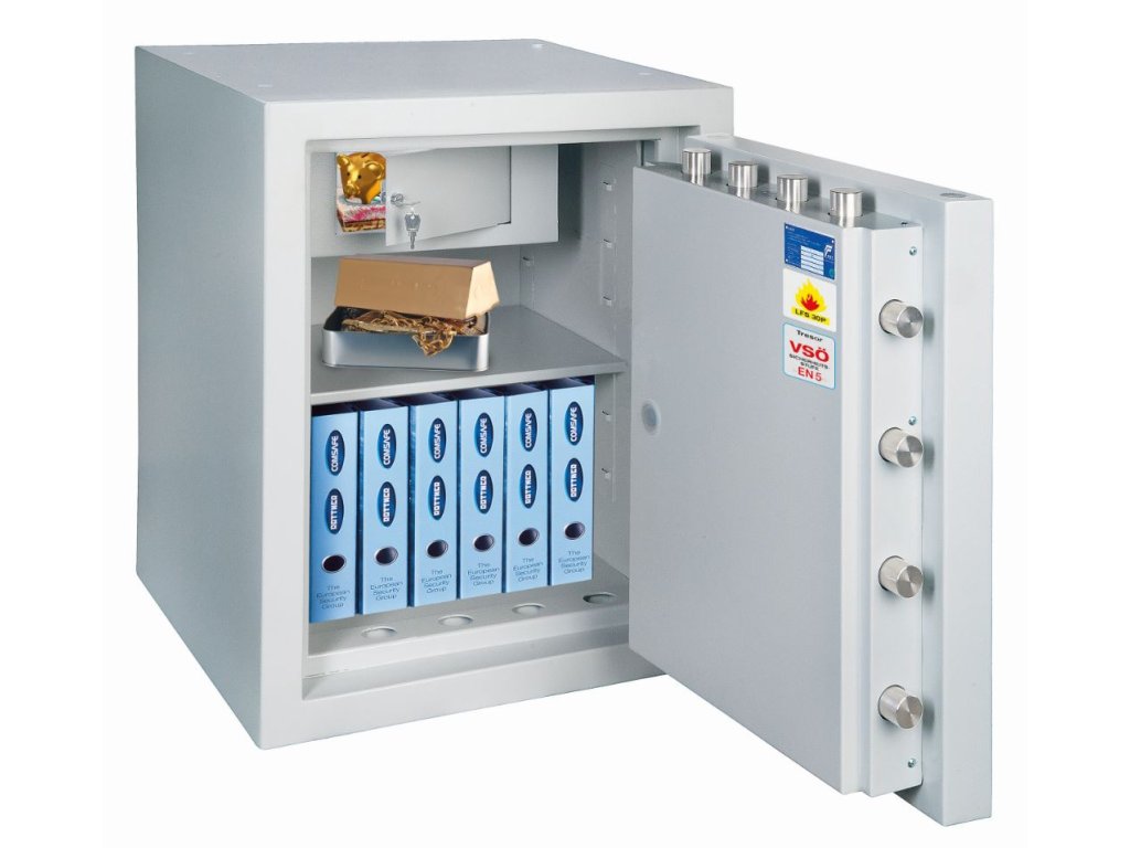 Certifikovaný trezorový a elektronický zámek Bezpečnostní třída V (ČSN EN 1143-1) Ohnivzdornost po dobu 30 minut pro papír Napájení 1 x 9V baterií (není součástí balení) Příprava pro EMA Vnitřní schránka a polička uvnitř