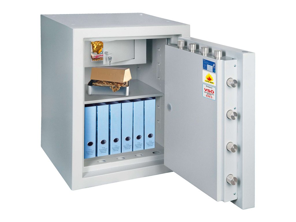 2 x certifikovaný trezorový zámek Bezpečnostní třída V (ČSN EN 1143-1) Ohnivzdornost po dobu 30 minut pro papír Příprava pro EMA Vnitřní schránka a polička uvnitř