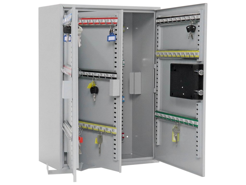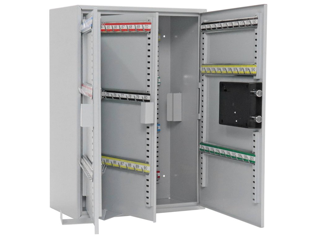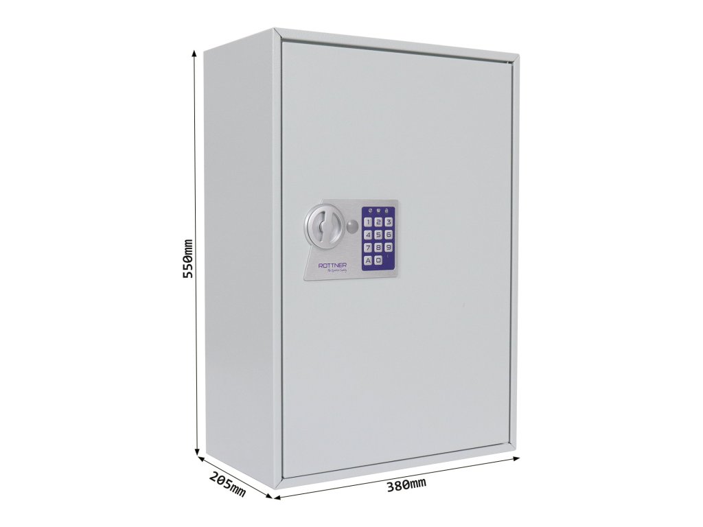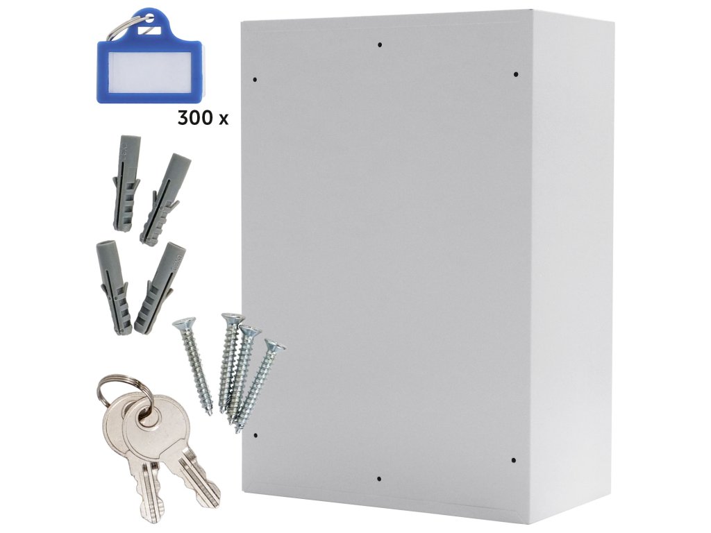 Hlavní výhody: Elektronický zámek Pozinkované háčky na klíče (300 háčků) Napájení 4 x 1,5V AA bateriemi (nejsou součástí balení) Dodávané spolu se 300 visačkami Výškově nastavitelná lišta s háčky Fixně umístěny háčky na lištách Upevnění na stěnu Mechanické nouzové otevírání s cylindrickým zámkem a 2 klíči Kvalitní ocelové provedení Naše největší skříňka na klíče z modelové řady S. Nabízí dostatek prostoru pro bezpečné a přitom stále přehledné uložení až 300 klíčů. Ty pěkně jeden vedle druhého můžete pověsit na fixně umístěny háčky. Háčky jsou umístěny na výškově posuvných lištách, které jsou barevně rozlišeny. Navíc, každý háček má své číslo. Uložené klíče jsou chráněny kvalitním ocelovým plechem a elektronickým zámkem. Přehledná klávesnice usnadňuje zadávání hesla a je spolu se zámkem napájena klasickými 1,5V bateriemi. Skříňku na klíče upevníte na stěnu pomocí otvorů na zadní straně. Potřebný materiál na upevnění je součástí dodávky.Doplňkové parametry