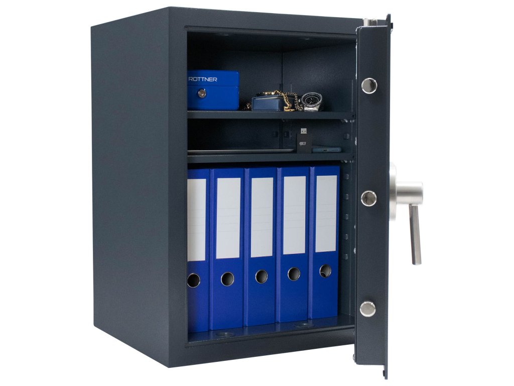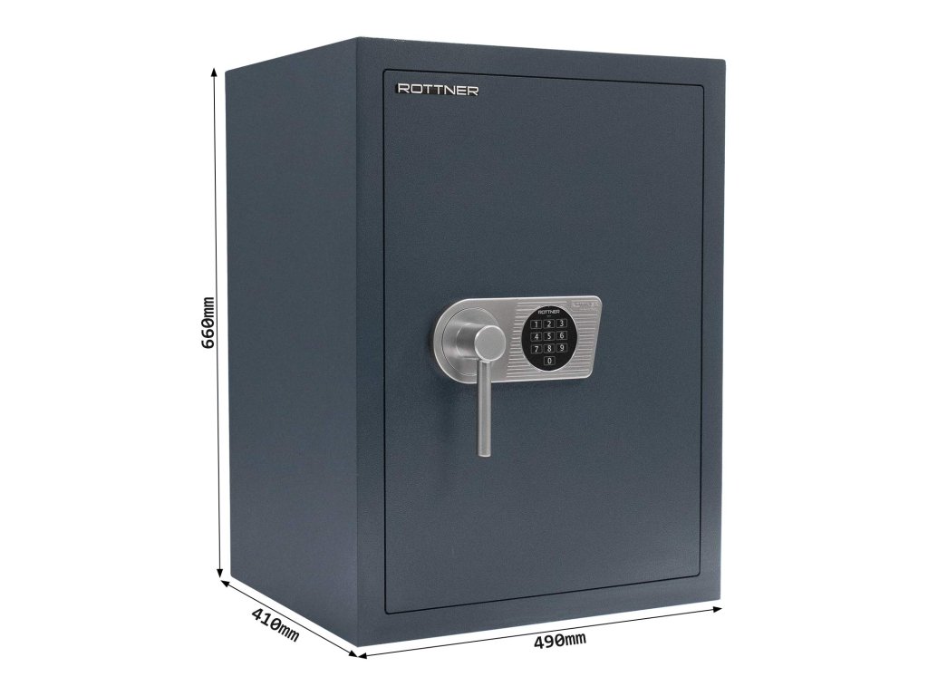 Certifikovaný klíčový zámek Bezpečnostní třída 0 (ČSN EN 1143-1) Napájení 1 x 9V baterií (není součástí balení) Dvouplášťový trezor 2 nastavitelné poličky