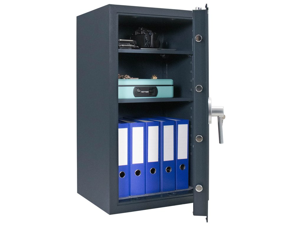 Certifikovaný trezorový zámek Bezpečnostní třída 0 (ČSN EN 1143-1) Dvouplášťový trezor 2 nastavitelné poličky