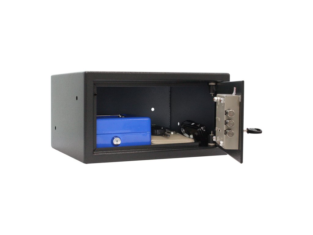Hlavní výhody: Standardní trezorový zámek s 2 klíči Jednoplášťový sejf Korpus hrubý 2 mm Tloušťka pláště dveří 4 mm Otvory na ukotvení na každé straně sejfu, kromě dveří Antracitový sejf v jednoplášťovém provedení nabízí korpus tloušťky 2 mm nabízí místo pro menší dokumenty, cestovní doklady, šperky nebo cennosti. Sejf disponuje standardním trezorovým zámkem s 2 klíči. Výhodou sejfu Saturn LE 170 je množství připravených otvorů na ukotvení. Otvory zároveň umožňují skládání sejfů do sestav. Kromě dveří se otvory nacházejí na všech stěnách sejfu. Materiál na ukotvení je součástí balení.Doplňkové parametry