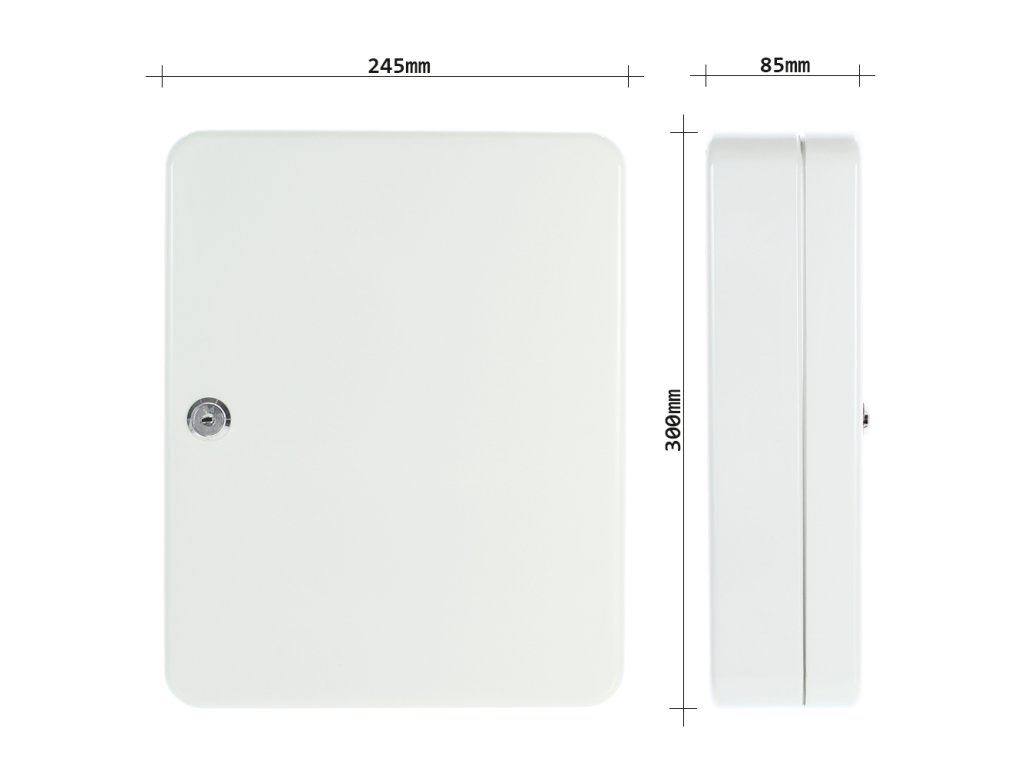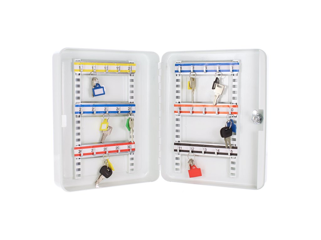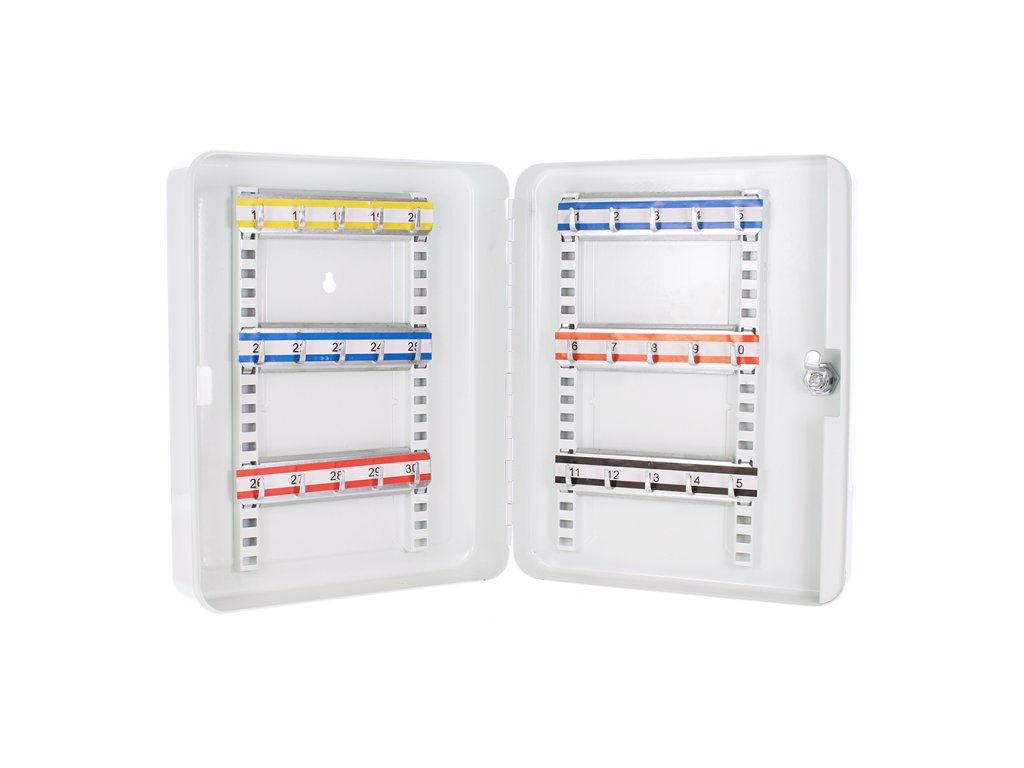 Hlavní výhody: Cylindrický zámek s 2 klíči Prostor pro 30 klíčů Fixně umístěny háčky na lištách Výškově nastavitelný lištý s háčky Kvalitní ocel Kvalitní skříňka na klíč značky Rottner nabízí dostatek prostoru na 30 klíčů, které potřebujete spolehlivě a přehledně uskladnit. Klíče můžete pověsit na háčky, které jsou umístěny na lištách. Lišty lze posouvat vertikálně nahoru a dolů, přičemž háčky na liště jsou fixně připevněny. Pro lepší přehled jsou jednotlivé lišty barevně odlišeny a jednotlivé pozice háčků očíslovány. Kromě skříňky na klíče najdete v balení materiál pro připevnění skříňky na stěnu.Doplňkové parametry