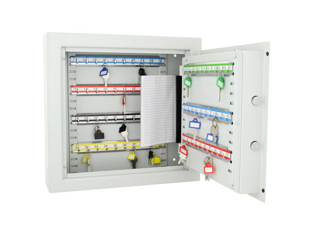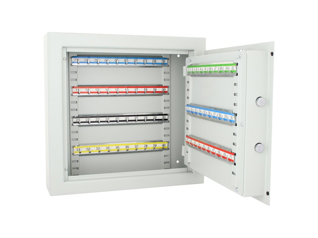 Hlavní výhody: Certifikovaný trezorový zámek s 2 klíči Jednoplášťový sejf Celkově 70 háčků pro 70 klíčů Fixně umístěny háčky na lištách Výškově posuvné lišty 3-stranný uzamykací mechanizmus Visačky v balení Elektronické nouzové otevírání externí baterií Otvory na zadní straně trezoru Sejf na klíče z modelové řady ST Premium nabízí místo pro přehledné uspořádání 70 klíčů. Uvnitř najdete celkově 70 háčků, které jsou fixně umístěny na výškově posuvných lištách. Lišty jsou navíc barevně a číselně rozlišené, abyste po otevření trezoru našli přesně ten klíč, který potřebujete. Jednoplášťové provedení spolu s 3-stranným uzamykacím mechanismem doplňuje certifikovaný trezorový zámek dodávaný spolu s 2 klíči. Spolu s trezorem obdržíte i 70 visaček pro klíče. Otvory na zadní straně slouží k ukotvení trezoru. Kotvící materiál je součástí balení. Kování zámku zvyšuje celkovou vnější hloubku sejfu o 15 mm.Doplňkové parametry