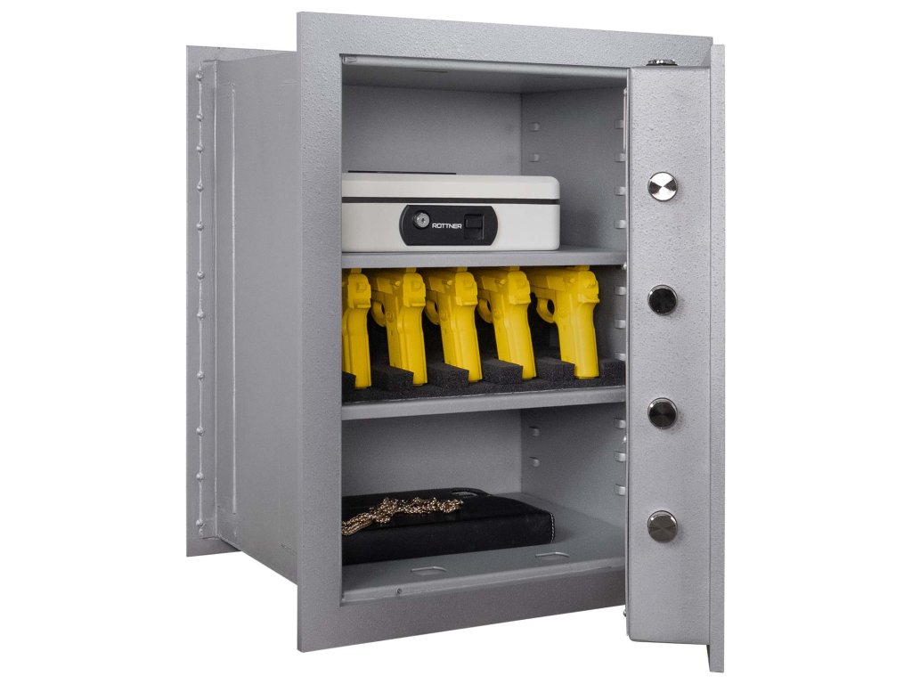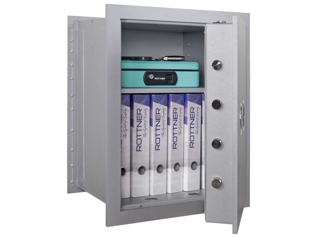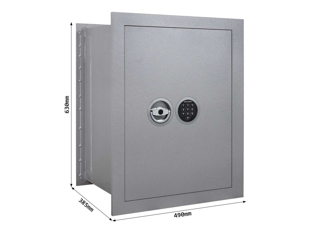 Hlavní výhody: Certifikovaný elektronický zámek Bezpečnostní třída I (ČSN EN 1143-1) Napájení 1 x 9V baterií (není součástí balení) Jednoplášťový korpus 4-stranný uzamykací mechanizmus Otevírání dveří do 90° 2 poličky uvnitř Minimální tloušťka betonové obezdívky kolem trezoru je min. 10 cm Elektronické nouzové otevírání externí baterií a vnějšími kontakty Možnost doobjednání vnitřního sejfu Možnost doobjednání teleskopické police Možnost doobjednání teleskopické registratury Stěnový elektronický trezor disponuje bezpečností třídou I (ČSN EN 1143-1) a nabízí spolehlivou ochranu pro uložené dokumenty, šanony, cennosti nebo osobní doklady, či cestovní doklady. Všechny uložené věci jsou chráněny jednoplášťovým korpusem, dveřmi hrubými 85 mm a uzamykáním na všech 4 stranách. Zámek je bez nouzového klíče a s napájením na 9V baterii. Uvnitř se nacházejí 2 poličky, které podle vašich potřeb mohou přerozdělit vnitřní dispozici trezoru. Kromě standardní výbavy je možné k trezoru doobjednat doplňkovou výbavu jako např. vnitřní sejf, teleskopickou polici nebo teleskopickou registraturu. Upozorňujeme, že při umístění stěnového trezoru je zapotřebí, aby síla betonové obezdívky kolem trezoru byla minimálně 10 cm.Doplňkové parametry