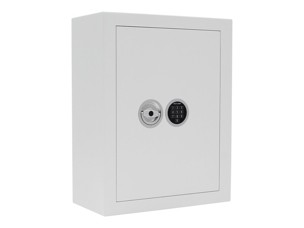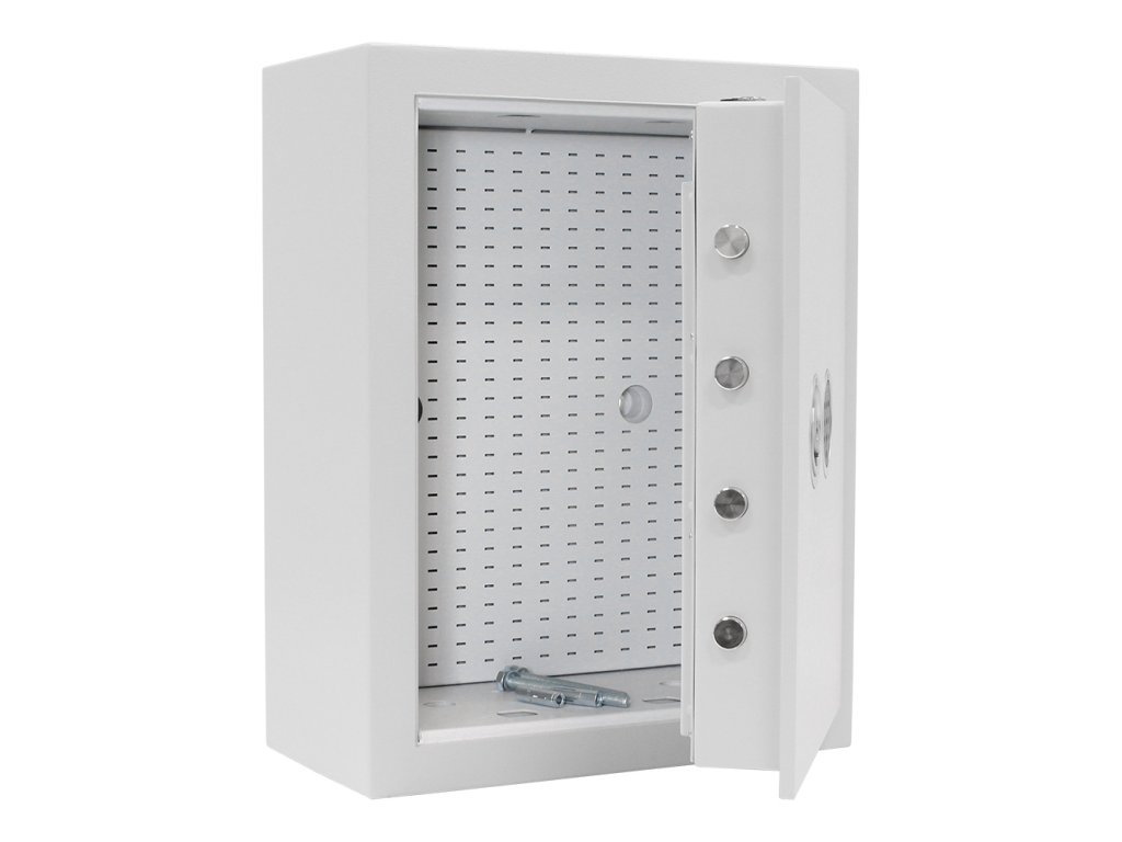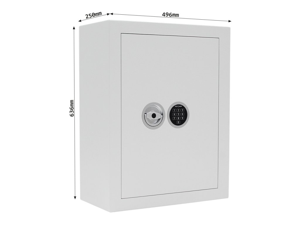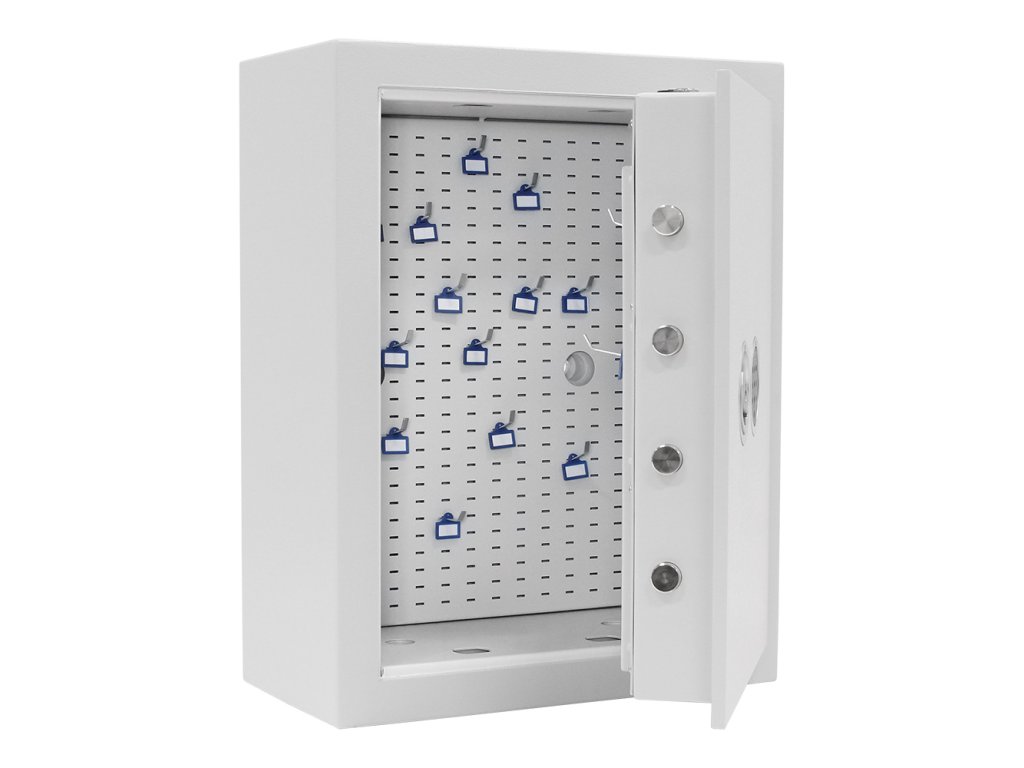 Hlavní výhody: Certifikovaný elektronický zámek Bezpečnostní třída I (ČSN EN 1143-1) Napájení 1 x 9V baterií (není součástí balení) Celkově pro 150 klíčů Háčky na klíče NEJSOU součástí balení 4-stranný uzamykací mechanizmus Korpus tloušťky 12 mm a dveře tloušťky 90 mm Víceplášťové korpus Otevření dveří až do 90° Otvory na ukotvení na spodní a zadní straně trezoru Šedý trezor na klíče z modelové řady STS nabízí místo pro uschování až 150 klíčů. Ochraňte své klíče kvalitním trezorem s certifikovaným elektronickým zámkem a certifikátem bezpečnostní třídy I (ČSN EN 1143-1). Napájení zámku a klávesnice je zajištěno klasickou 9V baterií. Dveře tloušťky 90 mm disponují 4-stranným uzamykacím mechanismem a uvnitř trezoru se nachází také 1 panel na klíče. Na spodní a zadní straně trezoru jsou připraveny otvory pro ukotvení. Kotvící materiál je součástí balení. Upozorňujeme, že součástí balení nejsou háčky na klíče a ani visačky. Kování zámku zvyšuje celkovou vnější hloubku trezoru o 60 mm.Doplňkové parametry